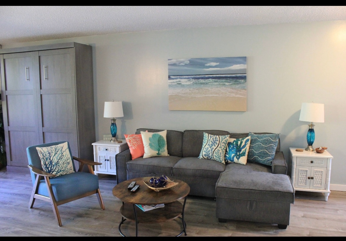 Aloha! Enjoy our updated, bright & beachy condo, located at the oceanfront resort, Islander on the Beach. Great central location, close to the airport and walking distance to shops and restaurants. Our unit is furnished with personal touches that make it perfect for couples looking for a comfortable space that doesn't feel like a hotel room. It features a king size bed w/memory foam, quality linens, private lanai w/ partial ocean view, beach gear for 2, a kitchenette and more!