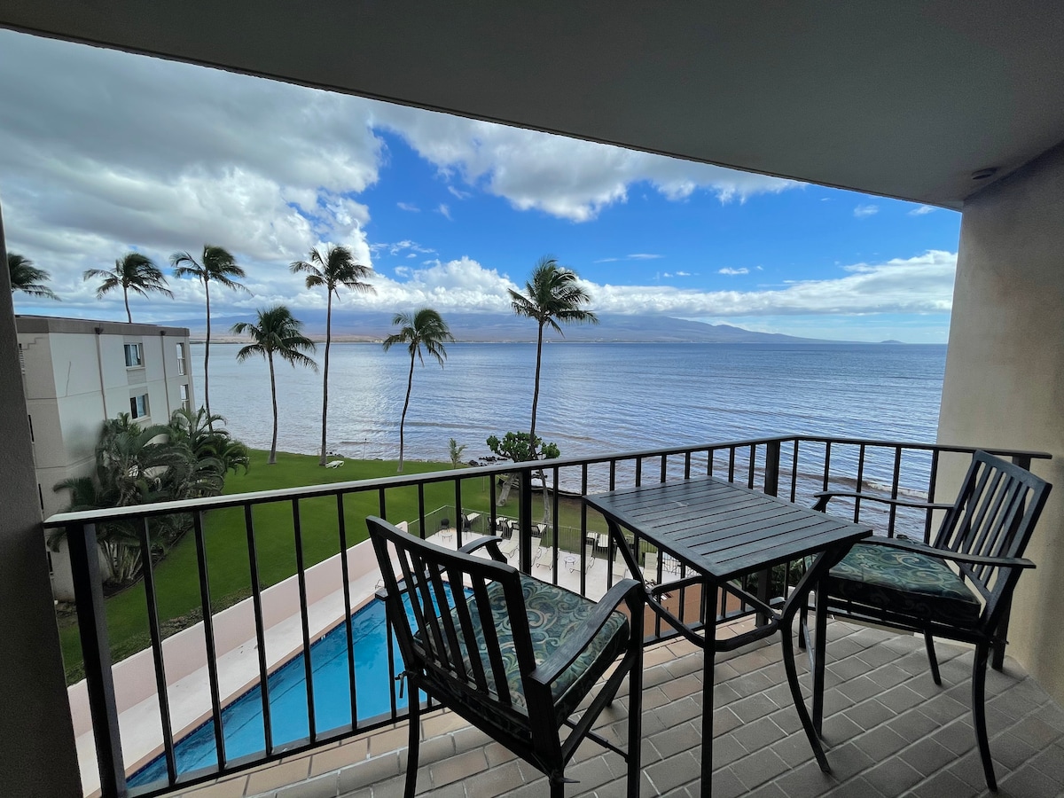 Direct ocean view on the 4th floor with spacious lanai. Newly renovated kitchen, hardwood flooring throughout condo. Master bedroom has a tempur pedic mattress. Living room has a pull out sofa with memory foam mattress. Walking distance to shops, restaurants, excursion activities, and Maui Ocean center. Centrally located with easy access to Kihei, Lahaina, and 20 minutes from airport. You are on right on the ocean!