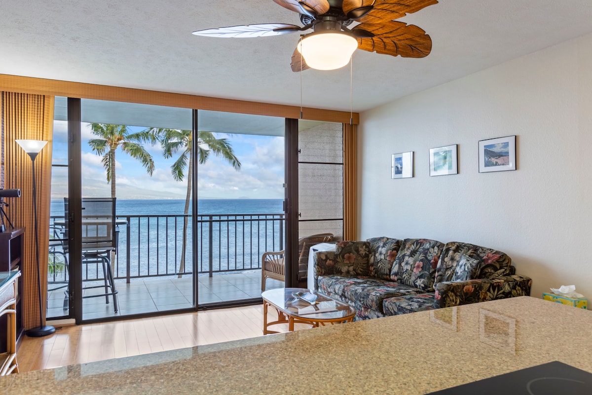 Direct ocean view on the 4th floor with spacious lanai. Newly renovated kitchen, hardwood flooring throughout condo. Master bedroom has a tempur pedic mattress. Living room has a pull out sofa with memory foam mattress. Walking distance to shops, restaurants, excursion activities, and Maui Ocean center. Centrally located with easy access to Kihei, Lahaina, and 20 minutes from airport. You are on right on the ocean!