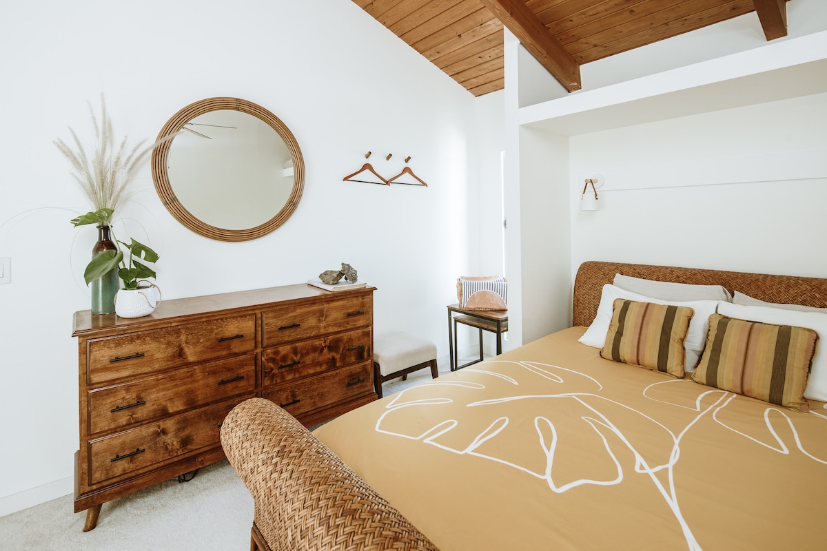 This is a comfortable 2 BD/2BA with rustic modern & eclectic decor, situated on a beautiful private acre of lush greenery. The living area is an open concept kitchen & living room with grand floor-to-ceiling windows showing off views of famous Mauna Kea. The generously sized master bedroom has a brand-new Avocado cal-king bed and a second bedroom offers a cozy queen. With a fully equipped kitchen & amenities, this is a perfect home base from which to begin or continue your Big Island experience!