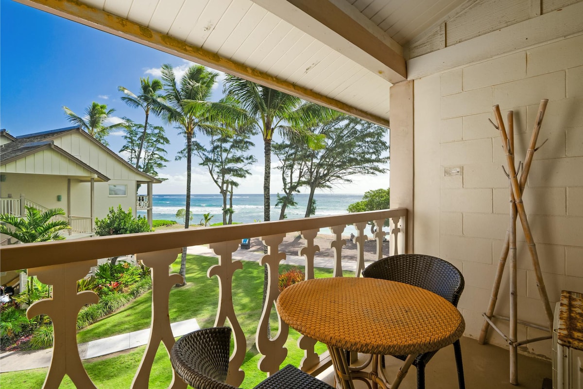 Enjoy the sound of crashing ocean waves, a gentle sea breeze & grand ocean view from your OCEANFRONT STUDIO CONDO. Watch whale breaching during winter season from your secluded balcony. One of the only remodeled units, with larger kitchen, luxury bathroom w/double vanity. Best location between the North & South shore. Close to restaurants, bars, grocery, attractions. 7 miles away from the LIH Airport. A/C, ocean-front pool, hot-tub & cabanas. No daily resort fees, free parking/beach gear.