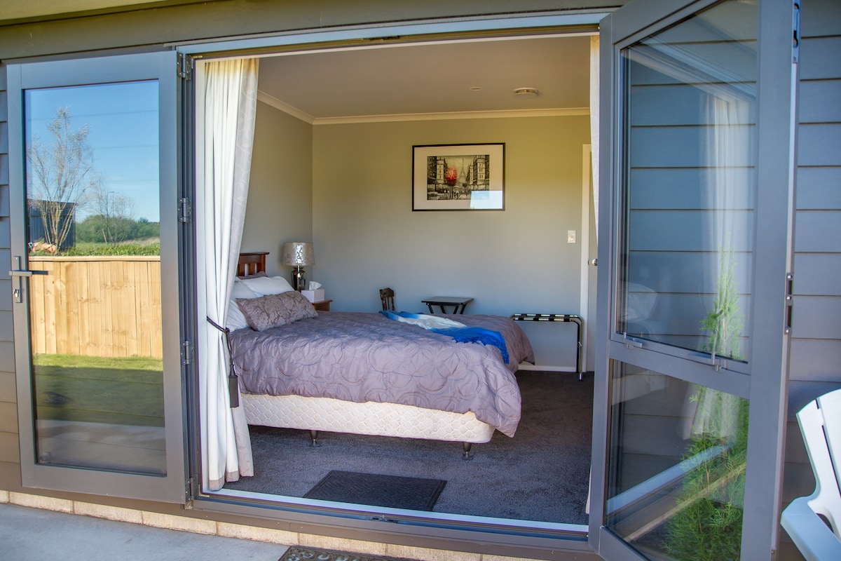 A world away from the world -Just 5 mins from Greytown. Situated on a small organic farm in a beautiful garden. Super comfy bed, stylish, mid century decor. Wake up to birdsong, star-gaze from the outside bath while listening to the call of the ruru. Loll by the pool or borrow the bikes to go exploring. Free breakfast of good coffee, homemade muesli & fruit, artisan bread and spreads. Free-range eggs & bacon available for you to cook for $20 pp. Drive on parking, heat pump, wifi & tv.