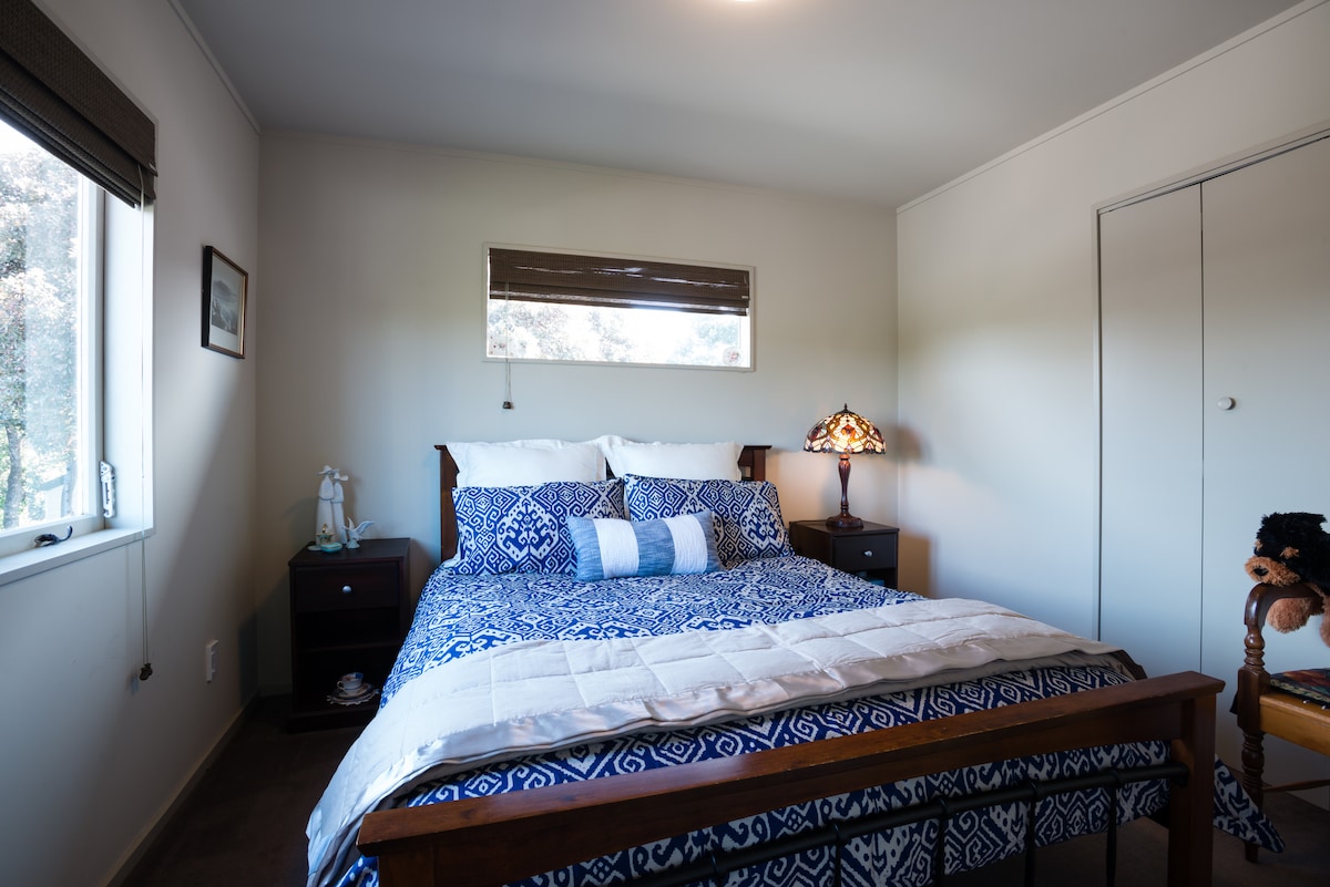 Our sunny, comfortable, two-storey house is ideal for a couple or a couple with small children. The master bedroom/ living area upstairs is spacious with beautiful views of Kapiti Island. The stairs are a little awkward for the elderly and the very young although we now have carpet tiles on the stairs. There is no handrail. There is no bathroom upstairs. Sitting/ kitchen area downstairs and the bathroom and second bedroom are also downstairs.