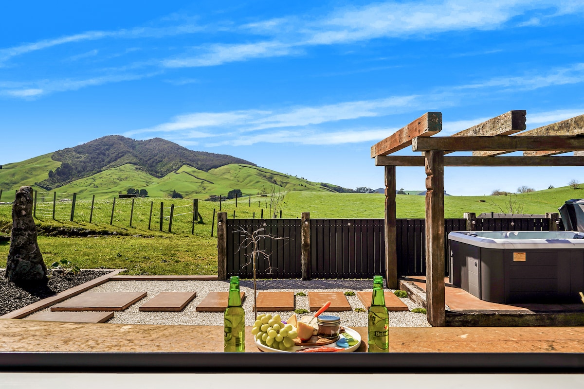 Escape to the country at Kakepuku View & Spa Retreat, a stylish one-bedroom getaway just 10 minutes from Te Awamutu. Perfect for a couple or small family, this peaceful lifestyle block offers sweeping rural and mountain views with modern comforts throughout.