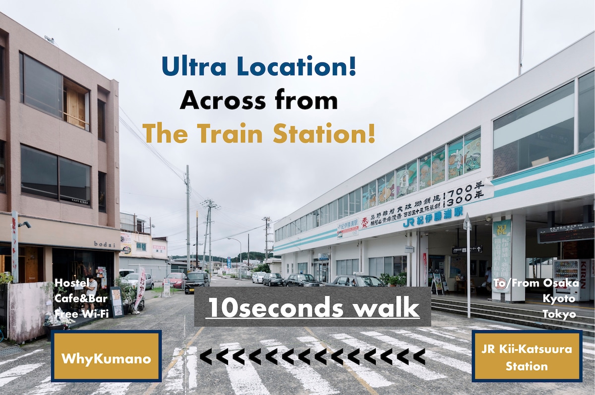 10 seconds walk from "Kii-Katsuura station". "Why Kumano" is located center of the town. The building is 3 story and second floor and third floor are "WhyKumano Hostel Cafe & Bar". The room is capsule bed There is one shared bathroom with a shower. There are local restaurants, convenience stores, super markets, souvenir shops, hot springs, and a fish market near the hostel. Perfect location for Kumano Kodo.