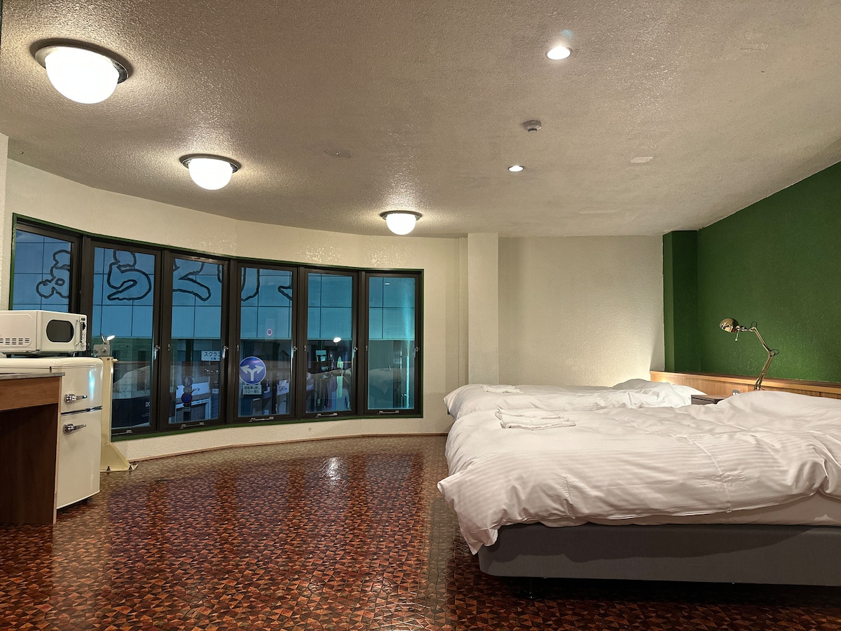 レトロな洋風建築のBeniyaビルをリノベーションした、和歌山市中心地のスイートルーム「Beniya Suite」へようこそ。約50㎡の1フロアをまるごと貸し切る贅沢な空間で、他のお客様に気兼ねなくお過ごしいただけます。 当施設はぶらくり丁商店街の入口に位置し、周辺には居酒屋やバーなど活気あるお店が軒を連ねています。建物の1階にはバルがあり、22時まで営業しているので、ちょっと一杯楽しむのもおすすめです。 ぶらくり丁商店街の隠れ家「Beniya Suite」 和歌山市は、高野山や熊野古道へのアクセスも良く、観光の拠点に最適です。当施設は、長期滞在も歓迎しておりますので、歴史と自然に触れる旅を心ゆくまでお楽しみいただけます。 室内にはダブルベッドが2台ございますので、カップルからファミリーまで幅広くご利用いただけます。レトロな雰囲気とモダンな快適さが融合した空間で、和歌山での滞在を心ゆくまでお楽しみください。
