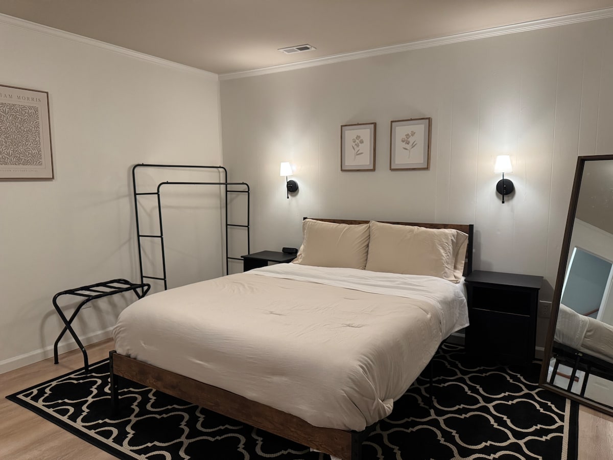 Welcome to our Private Luxury Master Suite! Enjoy a hotel-like experience with a spacious luxury bath featuring double sinks and a rain shower and a beautiful private deck with a peaceful view. We also include a coffee bar, work area, Wi-Fi, and TV. Conveniently located from RDU Airport and Downtown Durham, with a variety of restaurants and coffee shops nearby. Experience the perfect blend of comfort, luxury, and convenience in this upgraded suite! Parking is available and limited to 1.