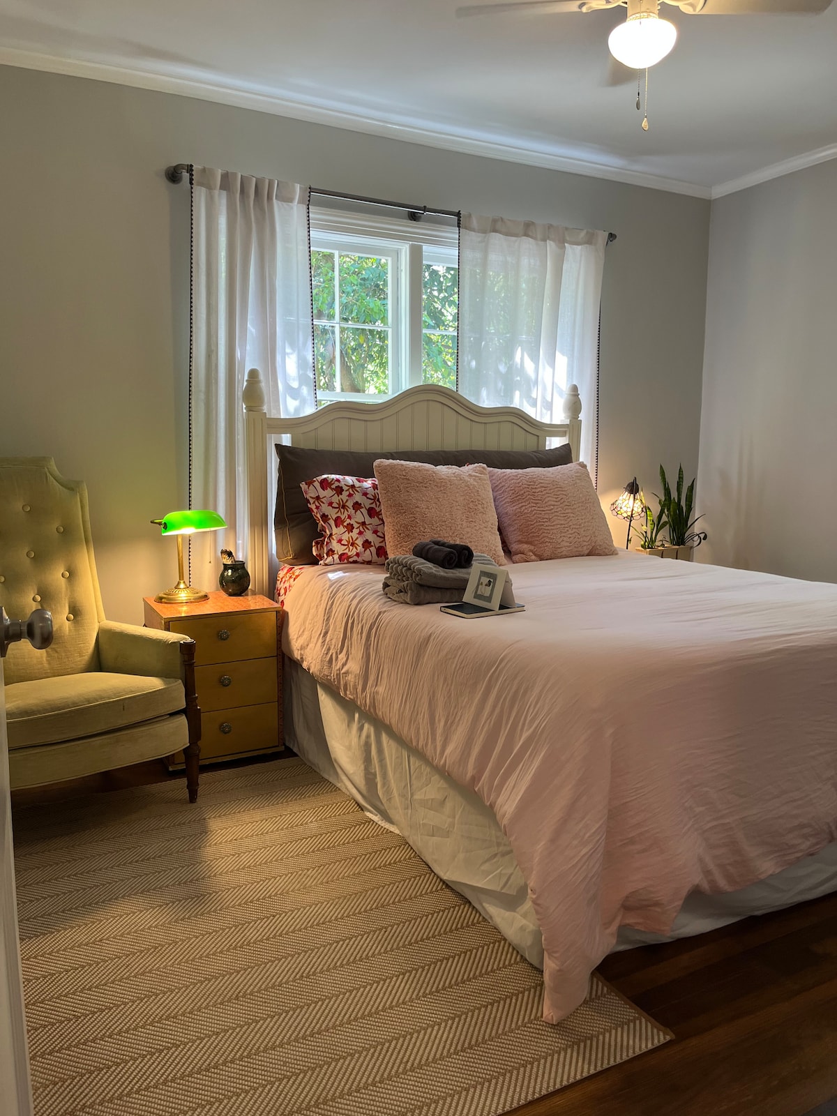 A private, restful & artful 2-BR apt. hosted by one of fewer-than-20 Airbnb Belo Award winners in the world. 900 sq. ft. complete lower fl. of 1960s brick split-level on unpaved lane near park. Lush garden. Private entry; parking; lvng rm w/fireplace; bthrm/shwr; kitchenette only; generous amenities; wifi; TV. Superhost since 2014; 1,000 5-star reviews. 1 mi. DPAC/Durham Bulls; 1.5 mi. Carolina Theatre; 3 mi. Duke U/Med Cntr. No added cleaning fee. Host fully-vaccinated; same expected of guests.