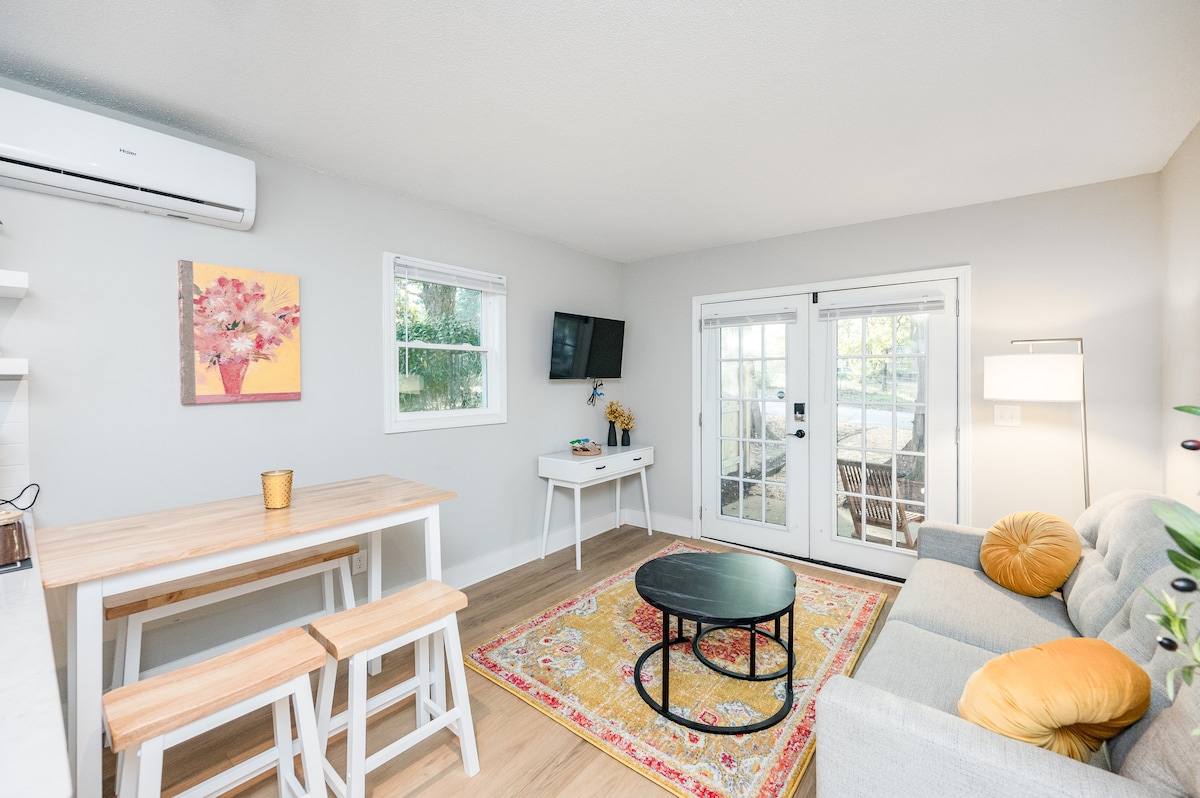 Charming guest cottage in Raleigh's Historic Glenwood Brooklyn district. Walking distance to quaint Five Points and trendy Glenwood South, or a 5-minute Uber ride from downtown Raleigh, Red Hat Amphitheater, and NC State University. One bedroom with queen bed, bath, kitchen, and pull-out sofa. There is plenty of natural light and perfect space for a weekend getaway. Features: Streaming services, wifi, keyless entry, custom closet, microwave, Keurig, and fridge.