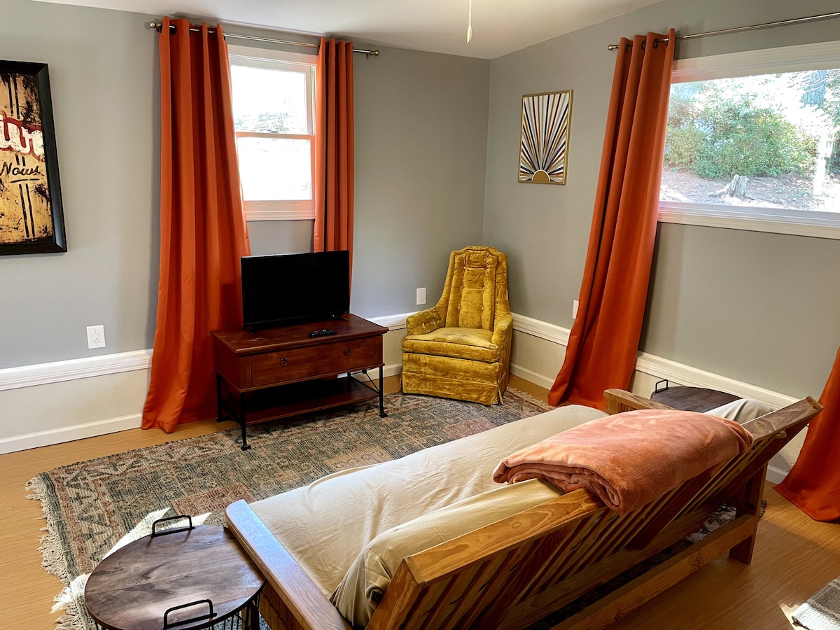 Minutes from downtown Raleigh, this private guesthouse is tucked away over the detached garage on the back of the property. Your own private entrance leads to a bright and open living space with lofty cathedral ceilings. Enjoy the comforts of a stocked kitchen, a quiet workspace, and a luxury California king bed. The cozy back patio is perfect for morning coffee! We are walkable to person street district, one block from the Brookside shops, and a short drive to NCSU. Permit #ZSTR-000021-2026