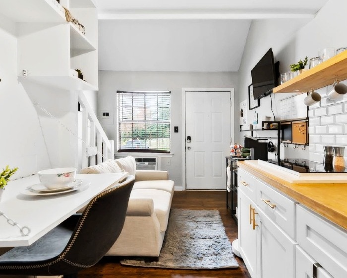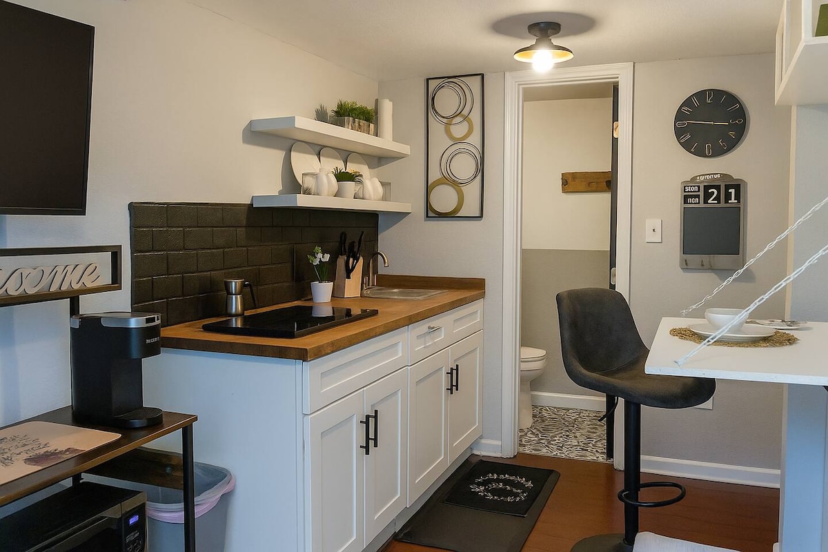 Experience serene comfort in this 252 sq ft miniature living loft. Bright and thoughtfully designed, it's placed near Downtown Raleigh and major hospitals. Whether visiting for leisure or necessity, the space offers a warm, calming retreat. For a touch of local character, a train may pass by softly in the distance from time to time, a gentle reminder of the city's pulse. This is small-space living at its most comforting and convenient.