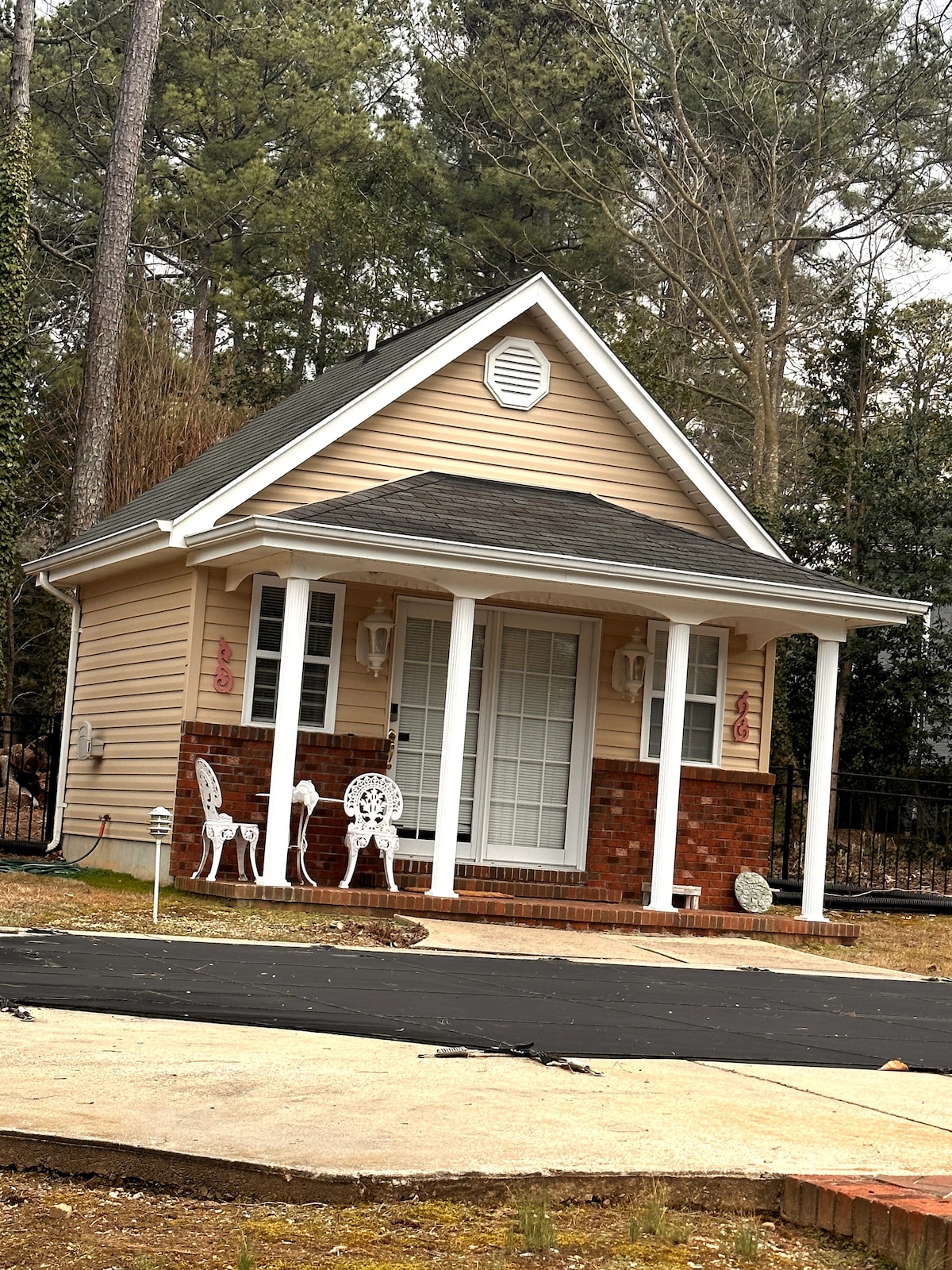 Cozy guest cottage backed by woods! 550 sq ft private house with loft bedroom, kitchen and bath (PLEASE NOTE NO FREEZER -only fridge) 30 min from Raleigh, Cary, Apex, and 10 min to Fuquay-Varina with 10 minute access to the 40. High speed wi-fi, smart tv, and complimentary coffee.Street parking-May not be a good fit for people with mobility issues. The front door is 110 steps from the street including a stone pathway down the lawn. Very dark at night-use phone light on path.