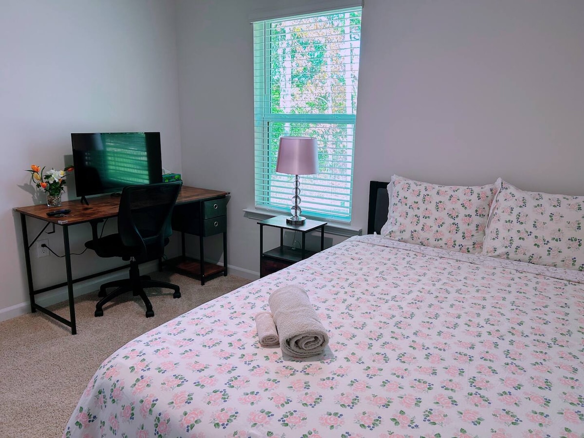 This room is located around 15 minutes from downtown. The room has a king size bed with private bathroom, a desk and a TV(Includes Netflix), Very spacious and quiet. There are 4 rooms on the second floor, one of which is the master bedroom, and the other 3 rooms share the bathroom. If you want to check the distance, you can refer to a supermarket that is 3 minutes drive from us: Food Lion: 6209 Rock Quarry Rd, Raleigh, NC 27610