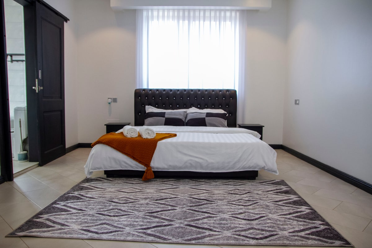 This Safe, Spacious & elegantly designed fully furnished apartment is centrally located in Entebbe, Kitoro. Each unit has living room with dining area & a well-equipped kitchen, 2 bedrooms with balconies & a total of 3 beds ( 1 Double bed & 2 Singles) The 2 single beds can be joined to form another comfortable double bed if need be. We are located 4 mins drive from the Airport & the UN RSCE base & a few minutes drive to the UWEC Zoo, Victoria Mall and the beautiful beaches along Lake Victoria