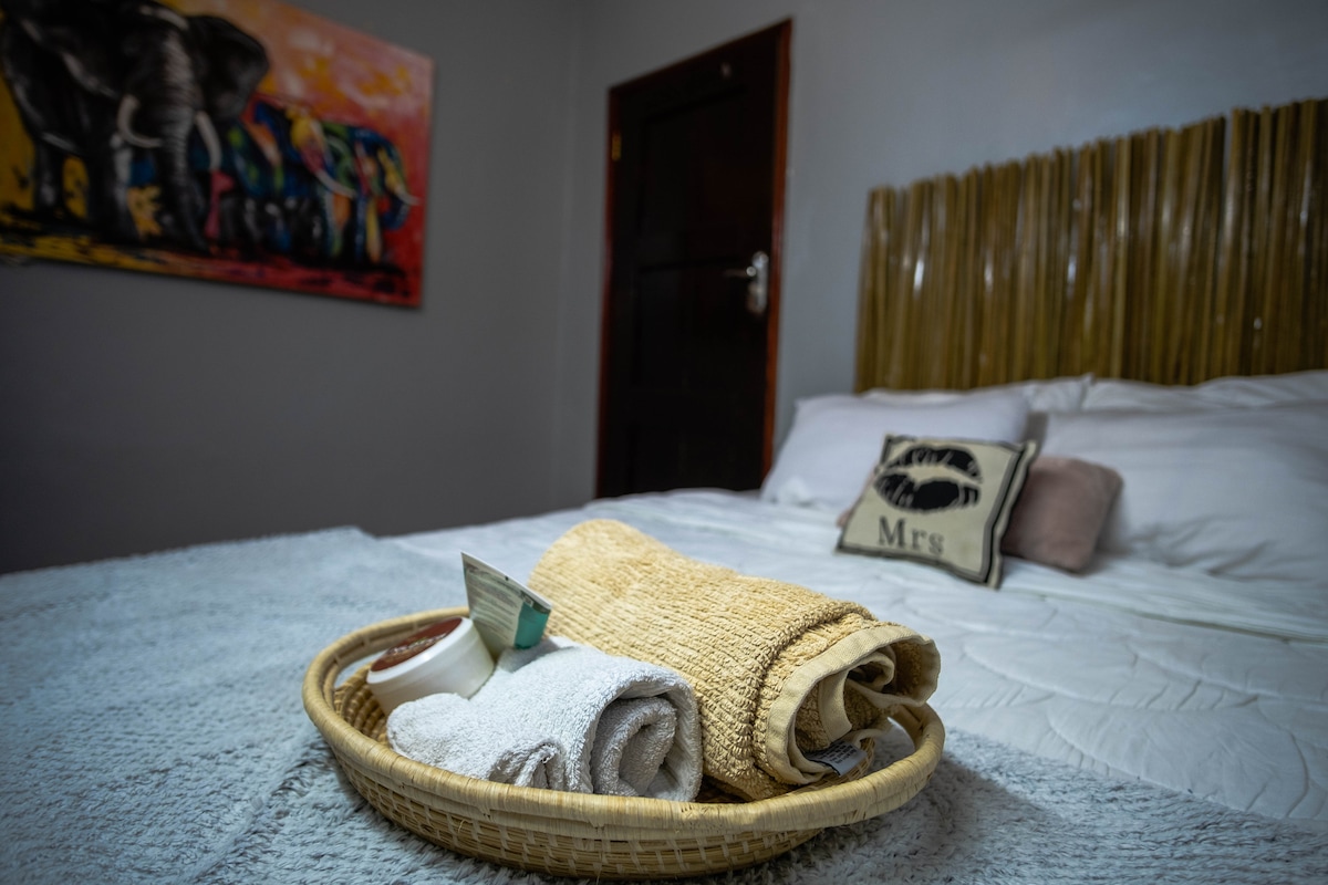 This is a Beautiful spacious ,charming, studio furnished and serviced apartment in the heart of Entebbe, just next to via via travelers cafe. We offer free Breakfast. Perfect for weekend getaway ,staycation. Unbeatable Location just 15 minutes Away from Entebbe International Airport. Fully functional kitchen , king size bed , washing machine ,private bathroom, 65-inch tv ,Netflix and wireless Wi-Fi. Air conditioning,24 hours security guards with outdoor cameras and a stand by generator.