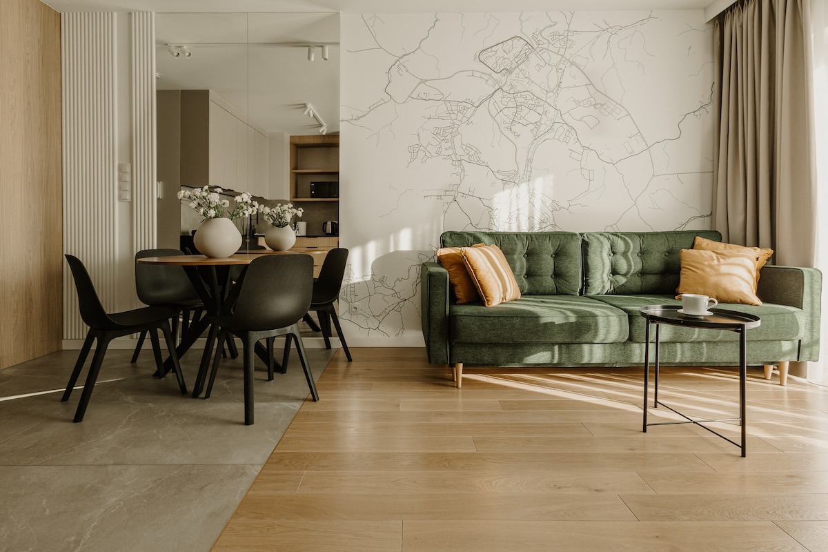 Premium Apartment Podzamcze to przestrzeń, w której poczujesz spokój, wygodę i jakość od pierwszej chwili. Drewniana podłoga, kamienne blaty i jasne wnętrza tworzą atmosferę, w której naturalnie się odprężasz. Wygodne łóżko, pełne wyposażenie i nowoczesna łazienka sprawiają, że pobyt staje się prostszy, wygodniejszy i naprawdę przyjemny. Idealny dla 4 osób – na city break, pracę zdalną lub rodzinny wyjazd. Miejsce, do którego chce się wracać.