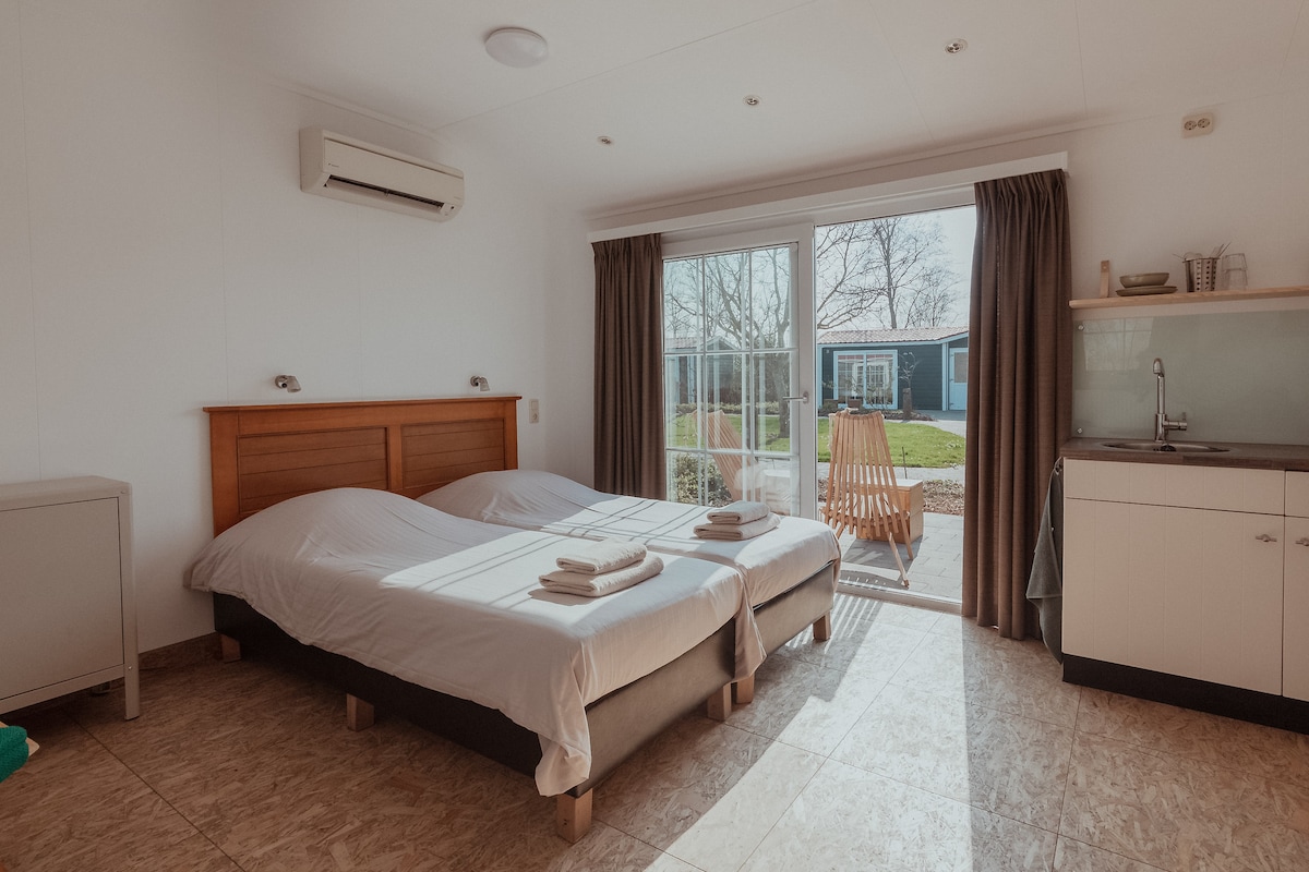 Comfortabele studio in groene omgeving aan de rand van natuurontwikkelingsterrein en camping ONS BUITEN. De studio ligt samen met andere studio’s rondom een groen veldje met oude bomen. Aan de voorkant vind je zitgelegenheid om te genieten van het ritme van de dag. ONS BUITEN ligt op korte afstand van het dorp en het strand (2,5 km). Fietsen zijn te huur. In onze horeca kun je terecht voor een lokale en vegetarische bagel, biologische koffie of huisgemaakte limonade.