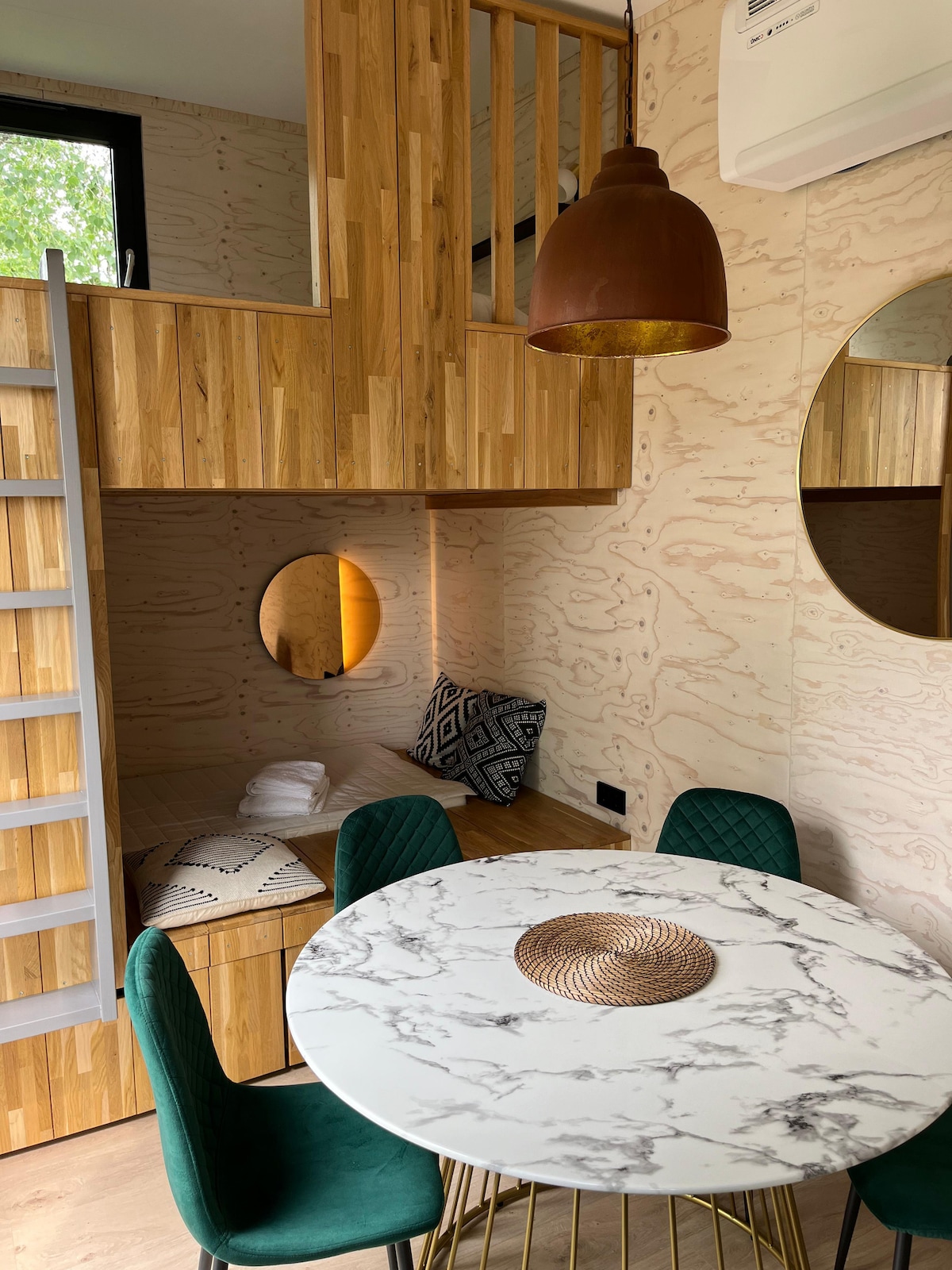 Caravan/Tiny house with one bedroom, one bathroom and bunk bed in the living room. Beautiful design with very efficient use of space.