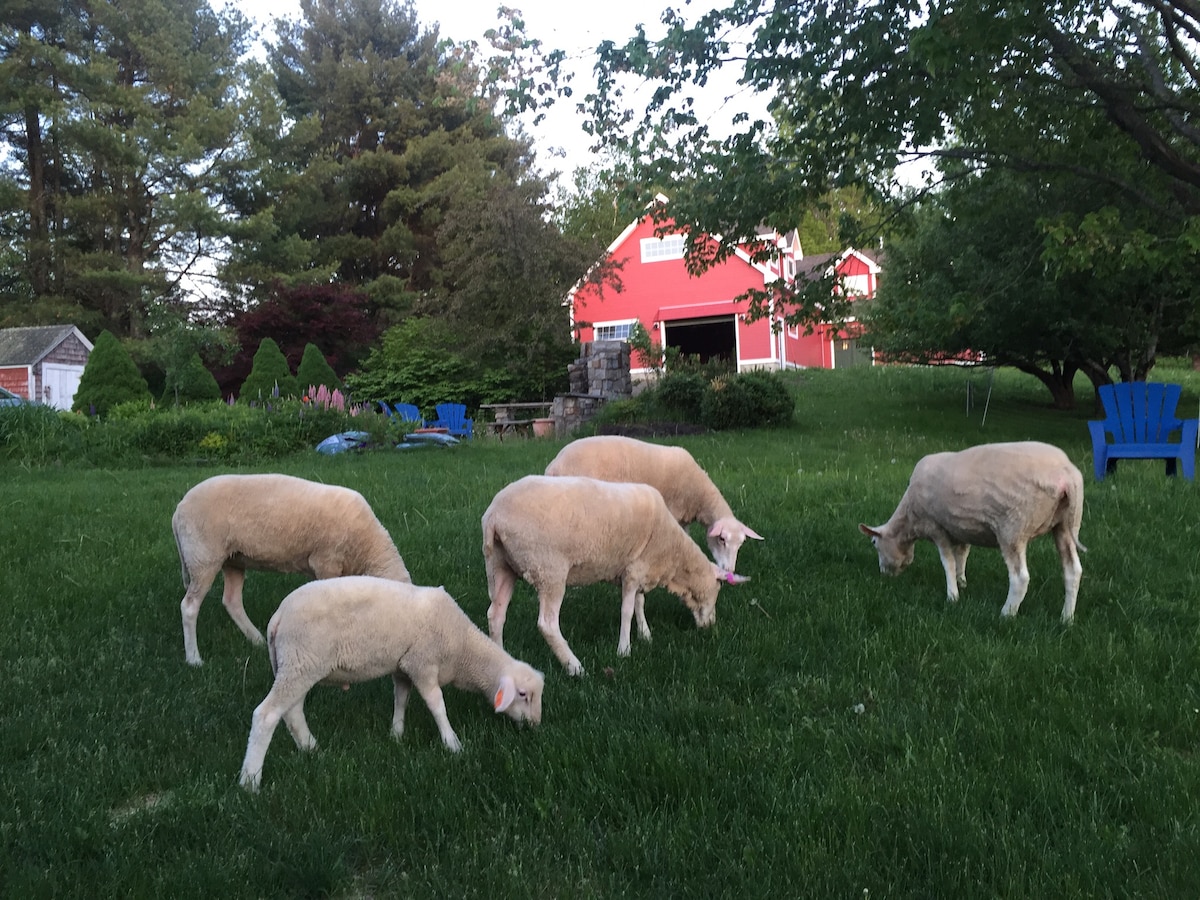 On the ridge with views to the mountains, Muzzy Ridge Farm offers a relaxing respite. Three comfortable bedrooms available (two queens, one twin) with a 1930's inspired dairy kitchen and a wood burning cook stove. The newly constructed rooms are annexed to the sheep barn with its thirty friendly, four-legged inhabitants. A scenic drive to Belfast, Camden, and Mid-Coast Maine. This room has a queen bed and a private bathroom and is located on the lower level down the hall from the kitchen.