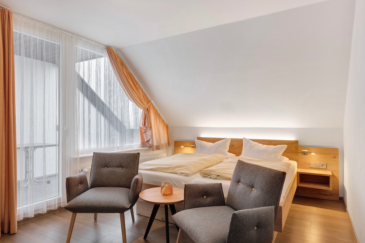 Large, cozy and lovingly furnished double room with sofa bed. The room is equipped with shower/WC, cable TV, seating and laminate flooring. The room can also be booked for 3 persons. A refrigerator and a kettle are available in the hallway. The special Black Forest house in the center of Titisee is waiting for you. Only 2 minutes to the lake, 8 minutes to the train station and 5 minutes to our beautiful pine forest and the idyllic Eisweiher pond.