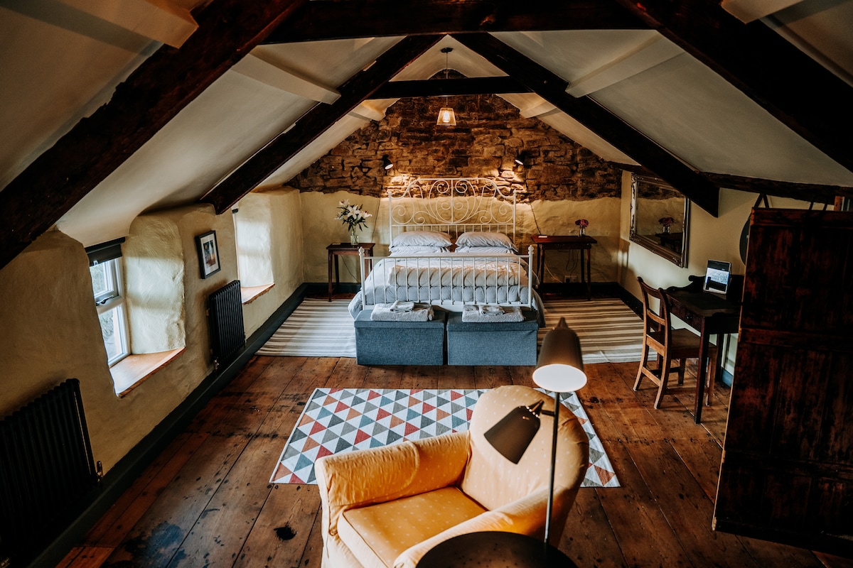 A crogloft is a traditional Welsh mezzanine, tucked away in the eves. Somewhere to quiet retreat to. Gwarcwm's Crog Loft is at the heart of the home, an old farmhouse beautifully restored. We hope you will love it as much as we do. The house is attached to a small field that slopes steeply down to a river at the bottom. We've recently finished building a sauna next to the river and installed a wood-burning hot tub, making this a perfect place to wind down when the day's adventuring is done.