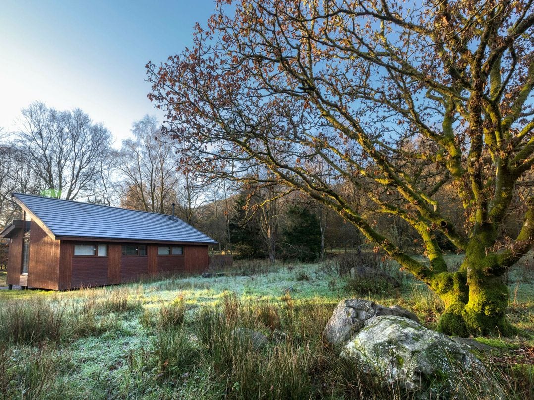 Beddgelert Golden Oak in Snowdonia National Park, sleeps 4. Single-storey with floor-to-ceiling windows, log burner, hot tub. Snowdon, heritage sites, sustainable tourism.