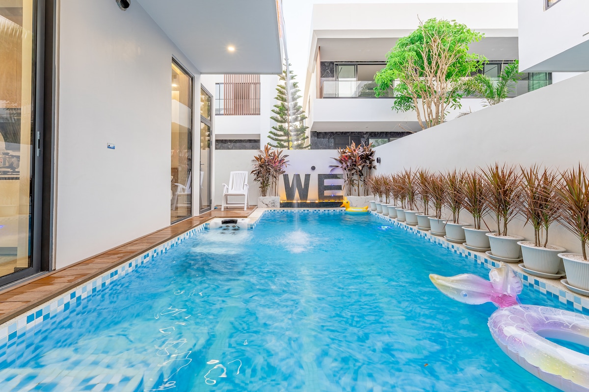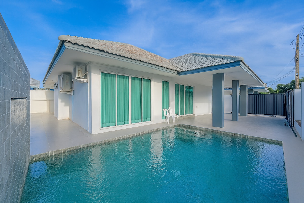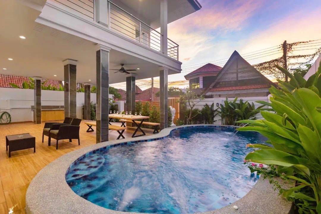 房源概况 这栋独栋泳池别墅位于芭提雅中天区域,设有5卧6卫,每间卧室均配备独立卫生间,智能马桶,保障客人私密性。别墅全新装修,空间宽敞明亮,配有独立庭院与私人泳池,可舒适容纳 10-12人,非常适合家庭、朋友聚会或团体度假。 地理位置 别墅距离中天海滩仅100米,步行即可到达。小区周边 300 米内拥有餐厅、咖啡店、药店和便利店,生活便利。驾车可快速抵达主要景点: • 3分钟:中天夜市 • 10分钟:Central 百货、唐人街、Terminal 21、79 成人秀 • 10分钟:步行街、格兰岛码头、美人鱼网红餐厅 无论是海滩、购物还是夜生活,都能轻松安排。 房屋亮点 • 5间卧室均为独立套房,配有智能窗帘 • 6个卫生间,多人入住也不拥挤 • 私人泳池与花园,定期维护 • 超大客厅和餐厅,适合聚餐和休闲 • 全屋空调、高速 Wi-Fi • 社区安静、安全,适合家庭入住 管家服务 提供 24小时管家服务,协助入住指引、路线导航 可选增值服务 提供曼谷/芭提雅接送机、包车服务、租车、包船出海、景点及秀场门票预订、私厨上门、上门烧烤、翻译等服务,让假期更加便利和轻松。