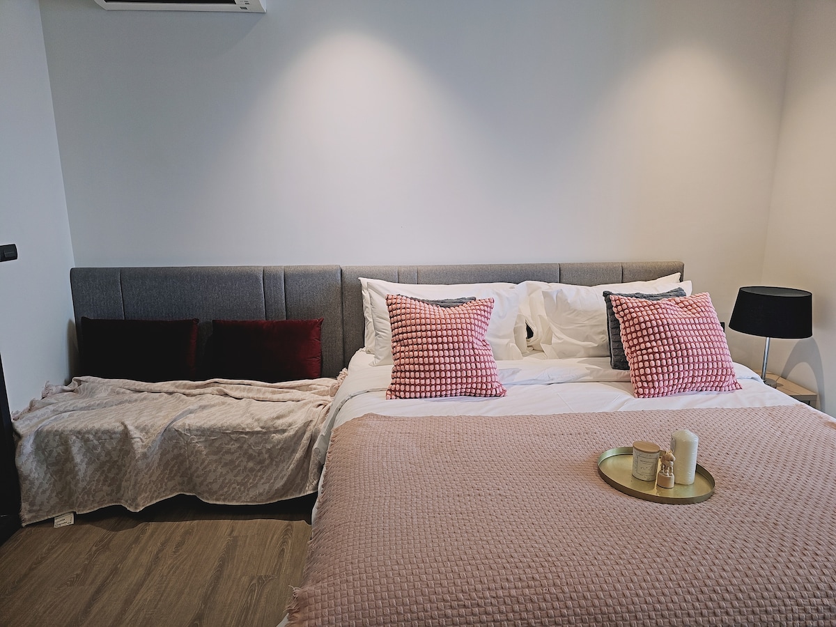 60 sq. m. room with 2 bedrooms, 2 bathrooms, and 1 kitchen - King-sized bed comfortable for 2 people (with a private bathroom) - Queen-sized bed comfortable for 2 people - A regular sofa for 1 more person - A private bathtub in the balcony section - Towel and bathroom items provided - refrigerator, stove, microwave, electronic kettle - pots and pans, dishes, cutlery, cups, wine glasses - smart TV (access to apps like Netflix & Youtube Premium) - High speed internet (500/500 Mbps)