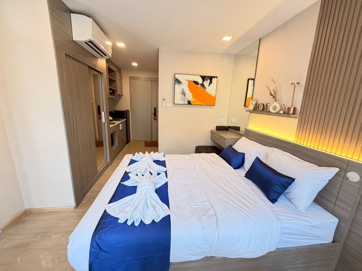 This sleek space creates a trendy backdrop for your stay.This hotel is located in a peaceful area just steps away from Jomtien Beach, perfect for guests seeking relaxation and privacy. The room is quiet, spacious, and thoughtfully designed for comfort. It features a fully equipped kitchen, a private balcony where you can unwind and enjoy the fresh sea breeze, and access to a shared swimming pool.