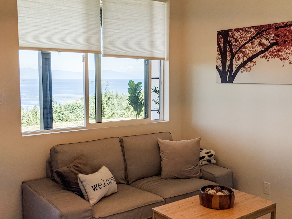 Our suite is a stunning, newly built one-bedroom retreat, featuring a 9’ ceiling and a generous 810 SF space. It features a 58" smart TV, and a fully equipped kitchen, ensuring a high-quality lifestyle during your travels. Revel in the breathtaking sunrise and sunset from your private balcony, with a magnificent view of the ocean and mountains across the Georgia Strait. Conveniently located, our suite is an ideal base to discover Vancouver Island’s allure.