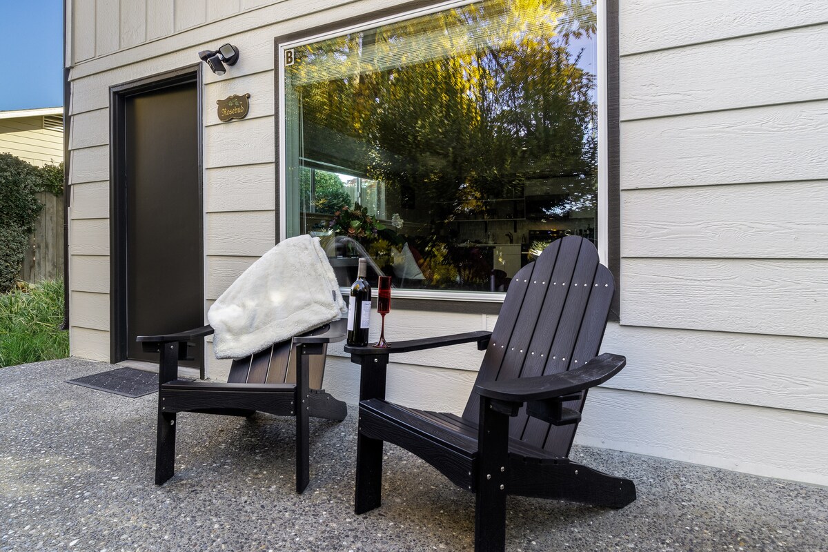 Romantic getaway in the heart of wine country! Kick back and relax in this serene, stylish space—a beautifully furnished one-bedroom apartment featuring a queen-size bed and two flat-screen TVs with Roku. In a quiet neighborhood with dedicated parking near entrance. Self-check in with the code sent on the day of arrival. Private patio area with table and chairs. The two-person spa is an ideal spot to unwind and take in the view. EV charger for free use. Small, well-behaved dogs welcome.