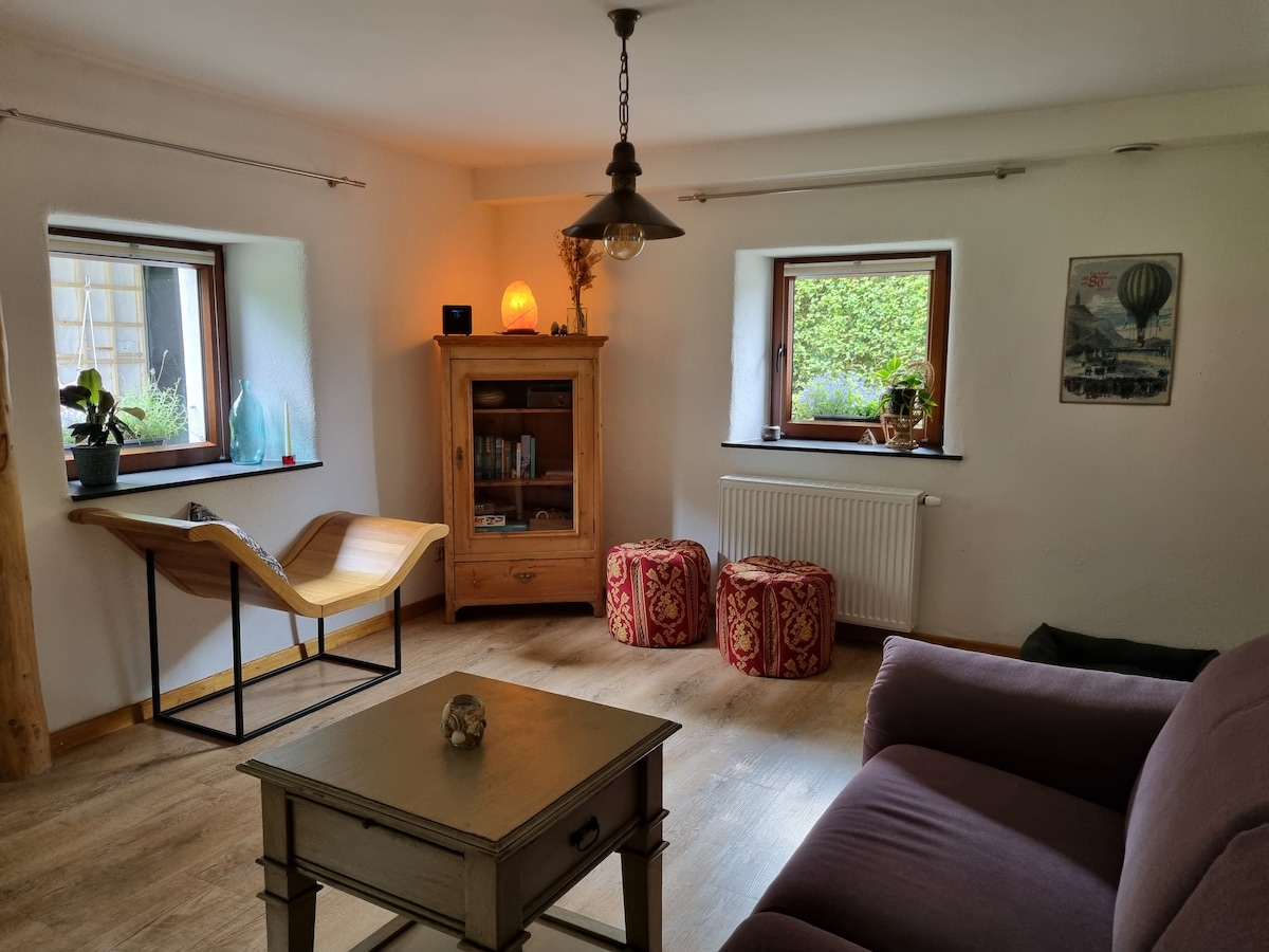 Situé dans une rue sans issue et donnant directement sur la rivière, la forêt, la faune et la flore, le gîte est un refuge de charme dans l'ambiance de l'Ardenne d'antan. Il dispose de trois terrasses surplombant la vallée du ruisseau du moulin, d'un verger, d'un potager en permaculture et du chant de très nombreux oiseaux. Prenez le temps de la nature dans ce logement calme et élégant.