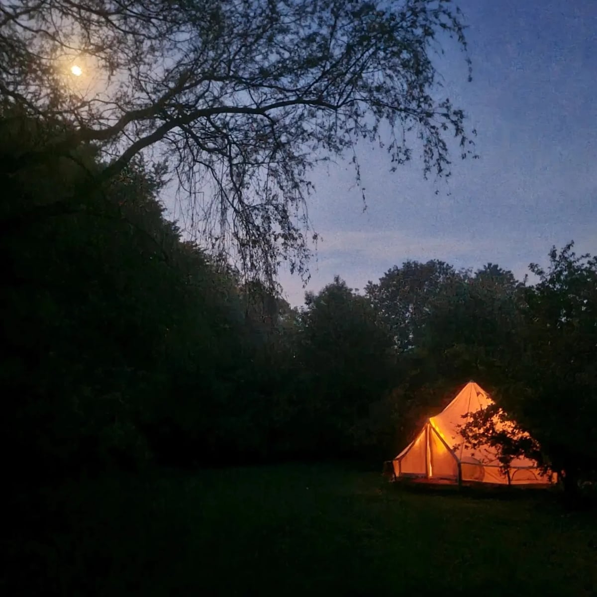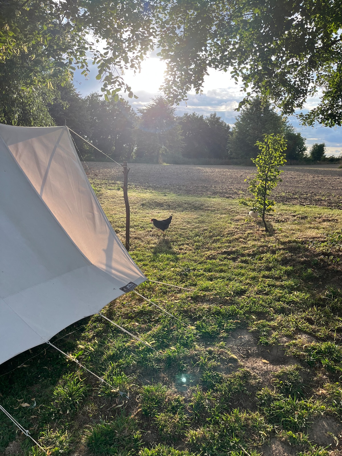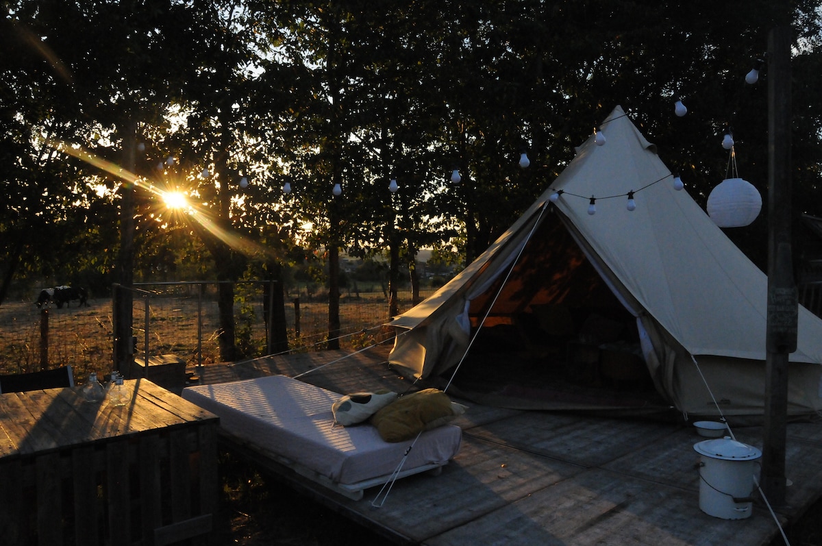 Simply furnished perched tent (table ext, 2 chairs and bed 1m40 with sheets and comforter, no kitchen equipment in the tent) with a very nice view on the village and the woods. The sheep walk in the field and come to wake you up... Toilet and shower in the house (50 meters), BBQ or campfire available (if too dry, only BBQ, wood/BBQ extra). Village with butcher shop, Bouillon at 8kms. Nice walks, Kayak, swimming in the river. Breakfast with supplement.