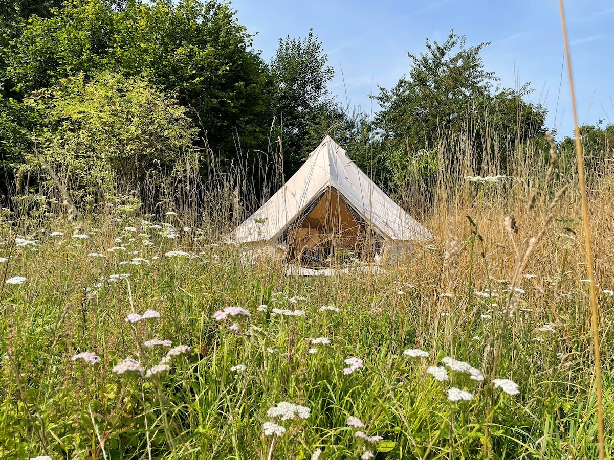 Tente glamping sur le thème des EXPLORATEURS au cœur de la nature attenant à la "Ferme de la Chevêche" - à 15 min de Namur, portes des Ardennes. Hébergement à la décoration scandinave et naturelle. Atmosphère cocoon et romantique, parfaite pour les couples, avec la possibilité de loger 4 personnes. Brasero + BBQ + poêle à bois à disposition. Toilette sèche à quelques mètres de la tente. Pour se laver : cruche d'eau et bassine à l'ancienne. Vue imprenable et couchers de soleil incroyables !