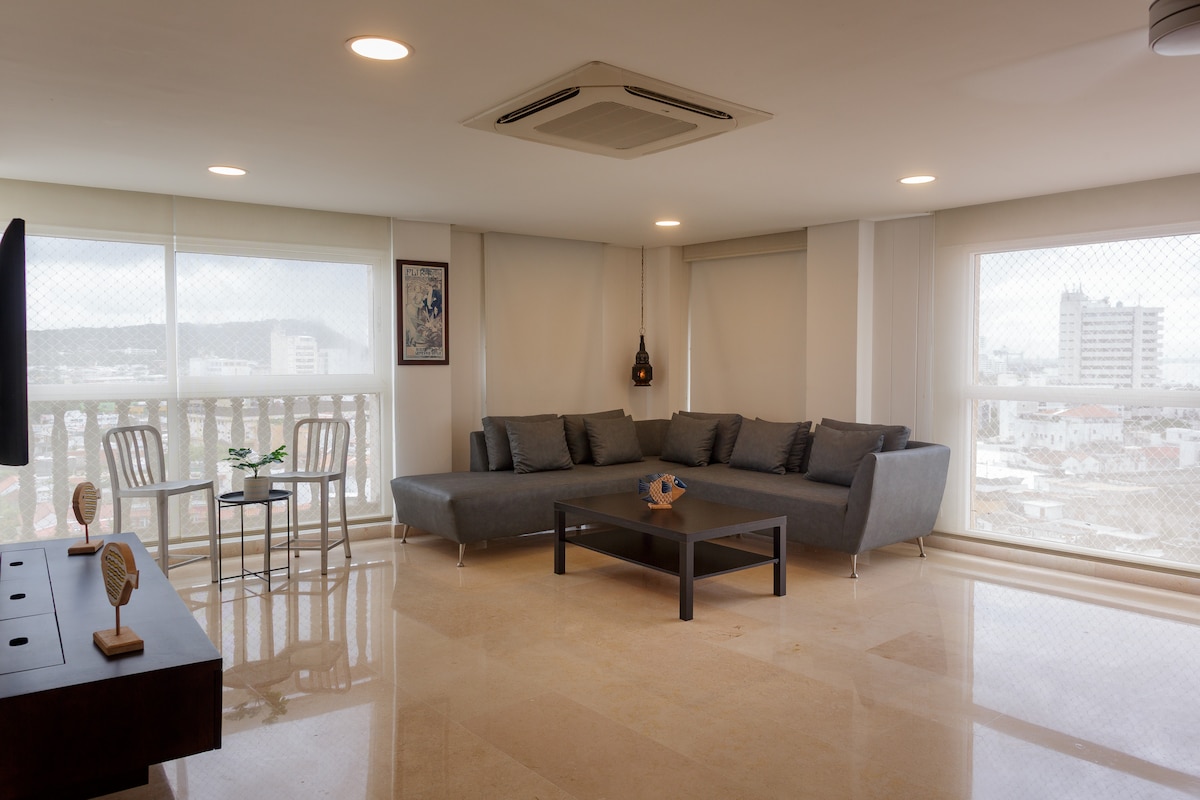 ✨ Welcome to your retreat in Cartagena: a luxury high-floor apartment facing the sea, with two private balconies and a 180° panoramic view of the Caribbean and the bay. Designed for your comfort, it features a modern living room with floor-to-ceiling windows, a fully equipped kitchen, fast WiFi, and digital check-in. Enjoy the infinity pool, poolside bar, and ocean-view gym. Located in Bocagrande, steps from the beach and minutes from the Walled City. 🌊🌴