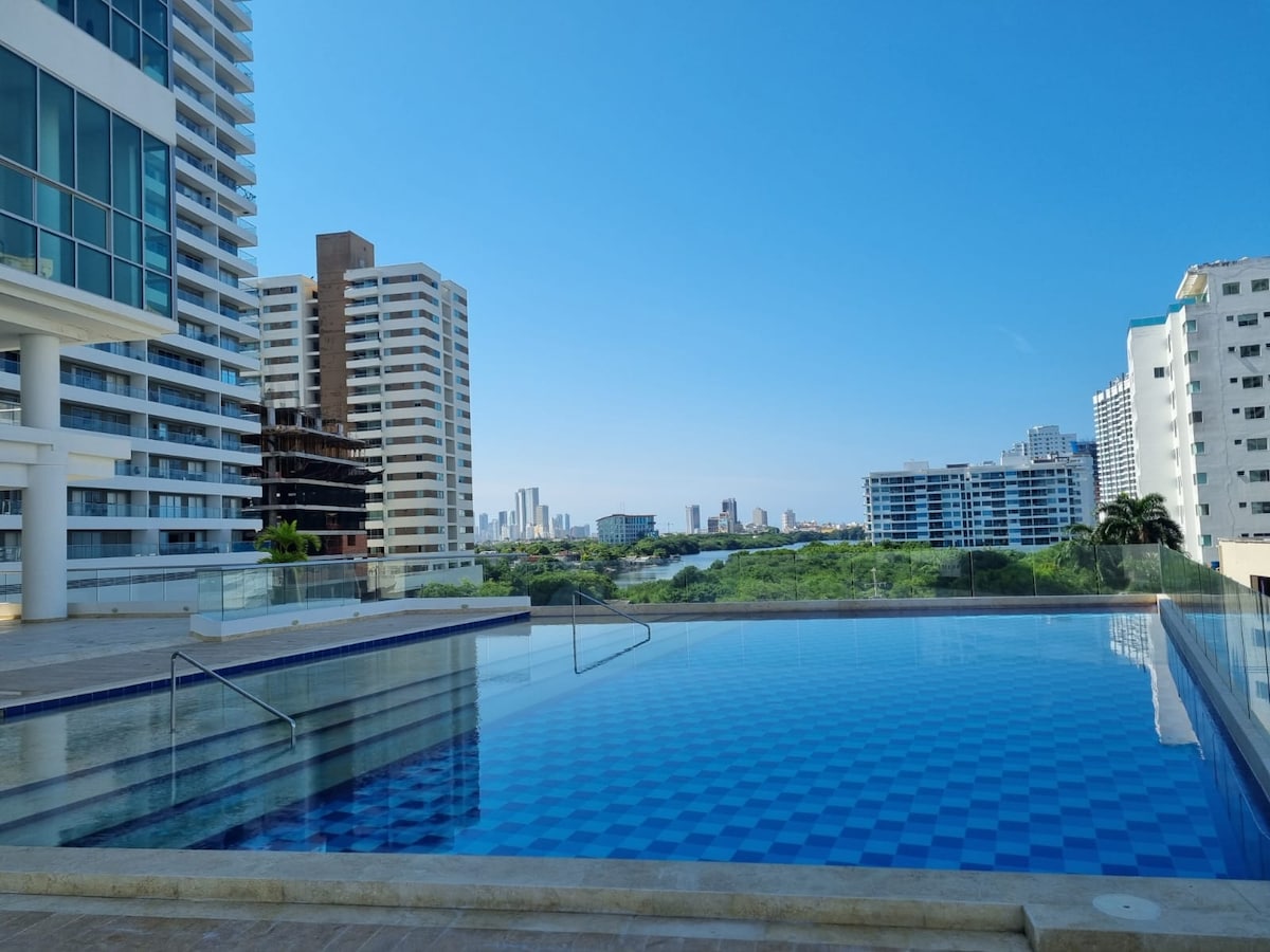 Amplio y bello apartamento de dos alcobas frente al mar, a 5 minutos del aeropuerto y del centro histórico. Nuestro apartamento es el lugar ideal para descansar y conocer la ciudad ya que su ubicación es muy central, cerca de todo. El apartamento esta completamente dotado para que te sientas como en tu casa. Adicionalmente, el edificio cuenta con hermosas áreas sociales: piscina de adultos y de niños, jacuzzis, sauna, turco, parque de juegos, gimnasio, etc. Y tiene seguridad las 24 hs. del día.