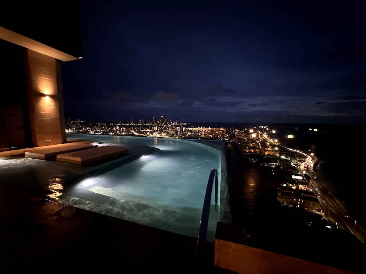 25th Floor Apartment – Ocean and Historic Center View 7 min from the Airport, 10 min from the Historic Center, and 6 min walking to the beach. 2 bedrooms with queen beds and Memory Foam mattresses, 3 bathrooms with showers, dryer, washer, and coffee machine with pods, herbal teas, sugar, and cream as a gift for guests. Amenities: 🛁Sauna |🧖♀️Turkish bath |🏊♀️Pools with panoramic view |🅿️Parking |🌊Beach access. Toiletries with verbena and lemongrass scent: soap, shampoo, and conditioner.