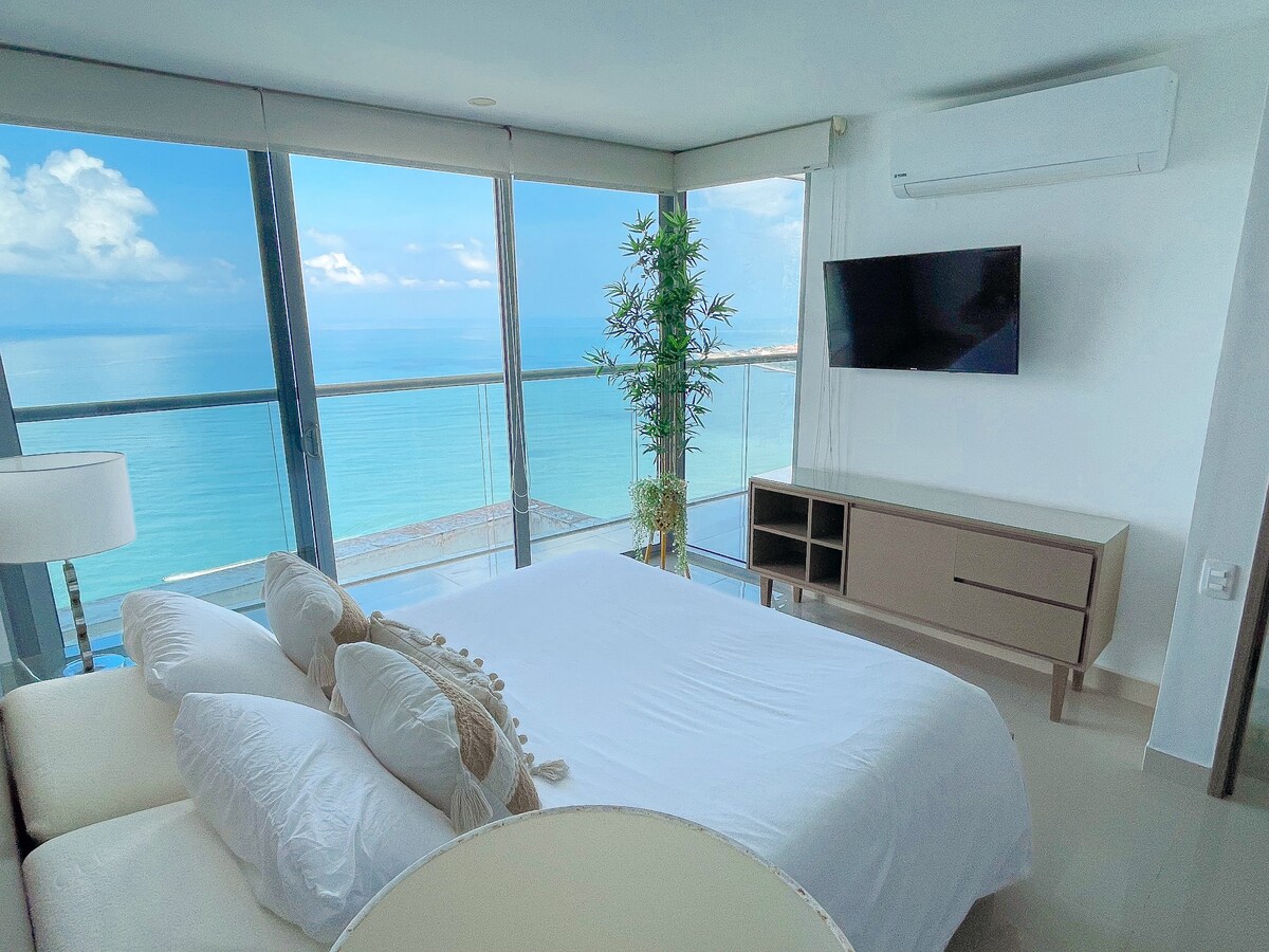 Perfect place to experience luxury and tranquility in Cartagena. Our suite offers a unique upscale atmosphere with beachfront views of the magnificent Caribbean Ocean. Our unit has been designed for guests who seek to enjoy the perfect combination between Zen & High Living vibes. Hear the splash of the waves when you wake up and when you are ready for a deep sleep. This modern building also features top of the art amenities like Gym, Jacuzzi and its popular Infinity Pool with breathtaking views