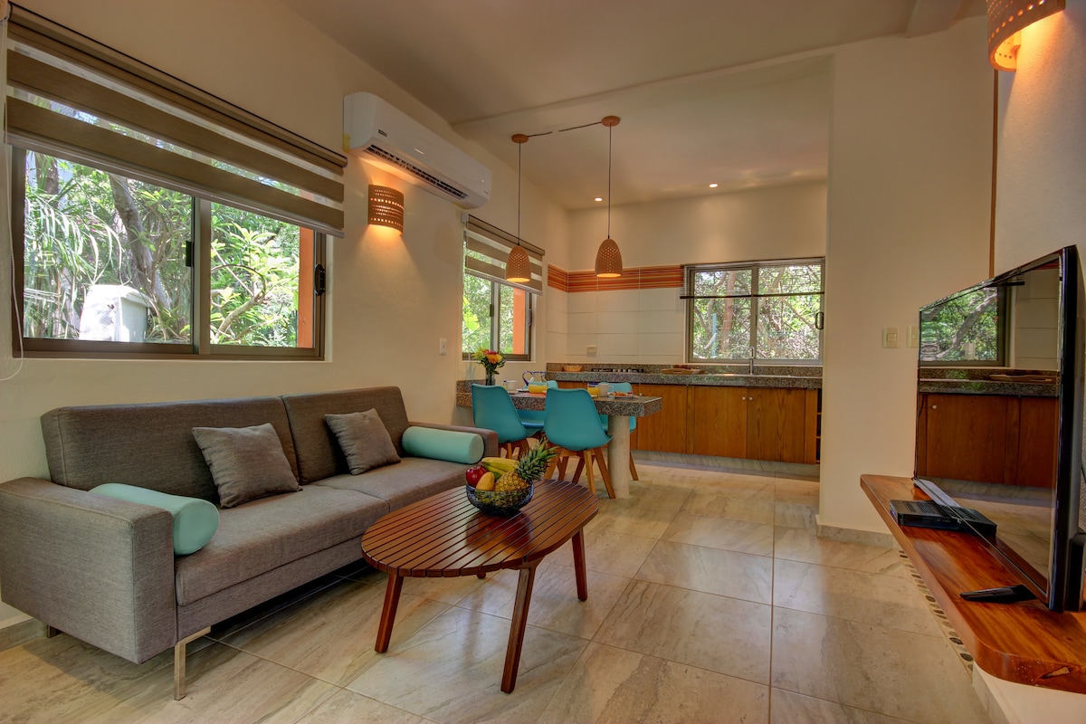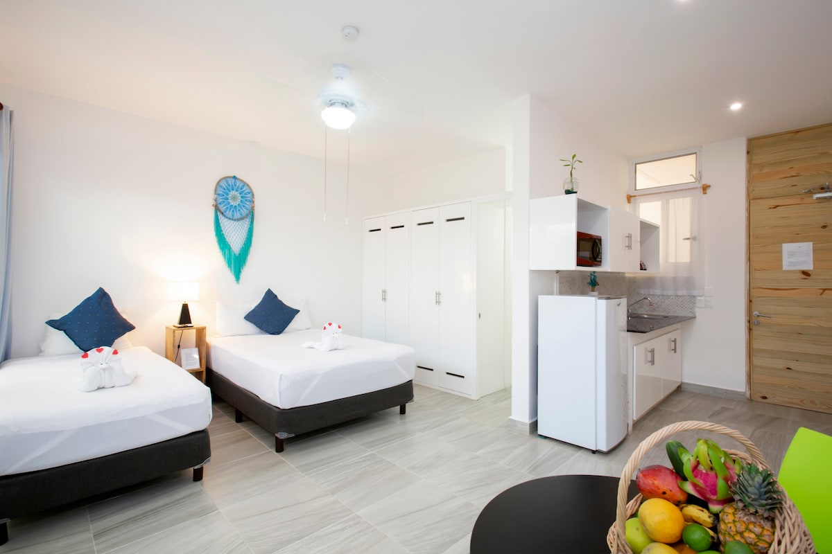 Studio suite in quiet area of Playa del Carmen for 4 guests, with one king bed and 2 singles (can be made up as 4 singles if you prefer) kitchenette, seating area, air conditioning, wifi, dvd player, daily basic cleaning, tours available and more!