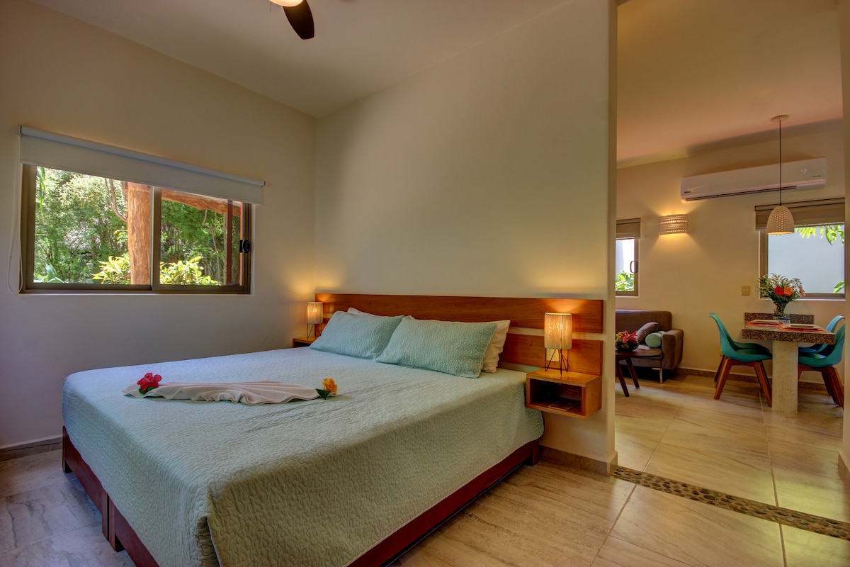 Studio suite in quiet area of Playa del Carmen, for 3 guests with one king bed and one single (can be made up as 3 singles if you prefer) kitchenette, seating area, air conditioning, wifi, dvd player, daily basic cleaning, tours available and more!