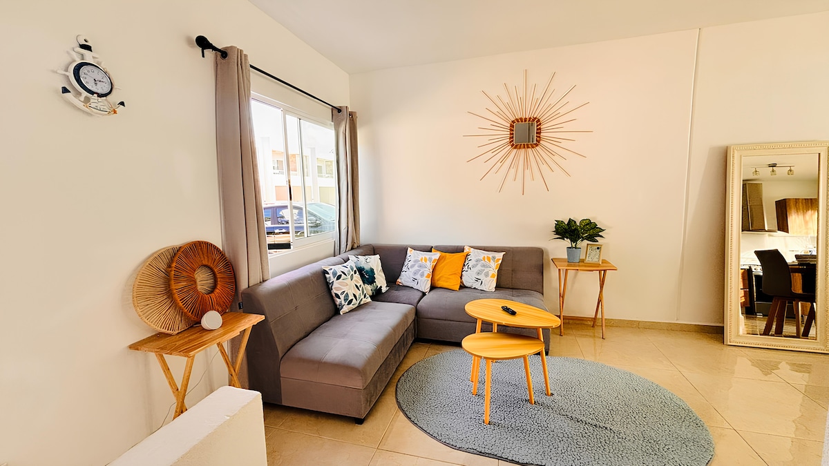 Comodo y luminoso departamento de una recamera con cama king size y tv de 38 pulgadas, sala con tv de 58 pulgadas, 2 banos completos, servicio de limpieza de lunes a sabado, cambio de toallas y sabanas una vez a la semana, ventiladores y aires acondicionados, horno convencional, microhondas y freidora de aire, a dos cuadras de una hermosa playa y a tres cuadras de una avenida principal. Desayuno incluido de lunes a sabado.