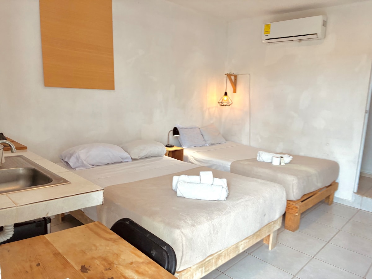 Disfruta de una estancia cómoda en un cogedor estudio ubicada en pleno corazón de Playa del Carmen. A solo unos minutos de MEGA, la playa y la quinta. Cuenta con 2 camas matrimoniales Baño completo (no cuenta con agua caliente) Aire acondicionado Una mesa que puede usarse como comedor o espacio de trabajo, cuenta con cocineta El edificio es tranquilo, ideal para descansar mientras disfrutas la conveniencia de estar cerca de todo. Para llegar a la habitacion se necesitan subir escaleras