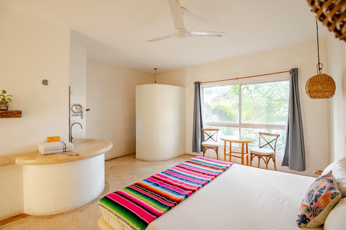 Tu punto de partida para vivir Playa del Carmen al máximo. Habitación con cama king en hotel boutique con rooftop, música en vivo, clases de baile y cócteles al atardecer. Todos los eventos terminan a medianoche — justo el equilibrio entre fiesta y descanso. Incluye desayuno gratuito, acceso a la piscina rooftop, yoga, pilates y más. A solo 2 cuadras de la 5ta Avenida y 3 de la playa. Ideal para parejas o viajeros que quieren disfrutar buena vibra, ritmo y nuevas conexiones.
