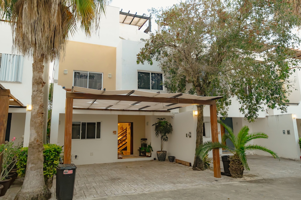 Beautiful luxury Mediterranean house in a very safe area. Approximately distance walking: - 7 mins from Walmart supermarket - 10 mins from 5th Ave. (the most important) - 13 mins ADO bus terminal - 15 mins to the beach Stay in a house with top finishes, pool, first and second level terrace. The rooms have air conditioning, private bathrooms, fans, Wifi and more. Perfect for families, couples or friends. Book and enjoy your time in Playa del Carmen!