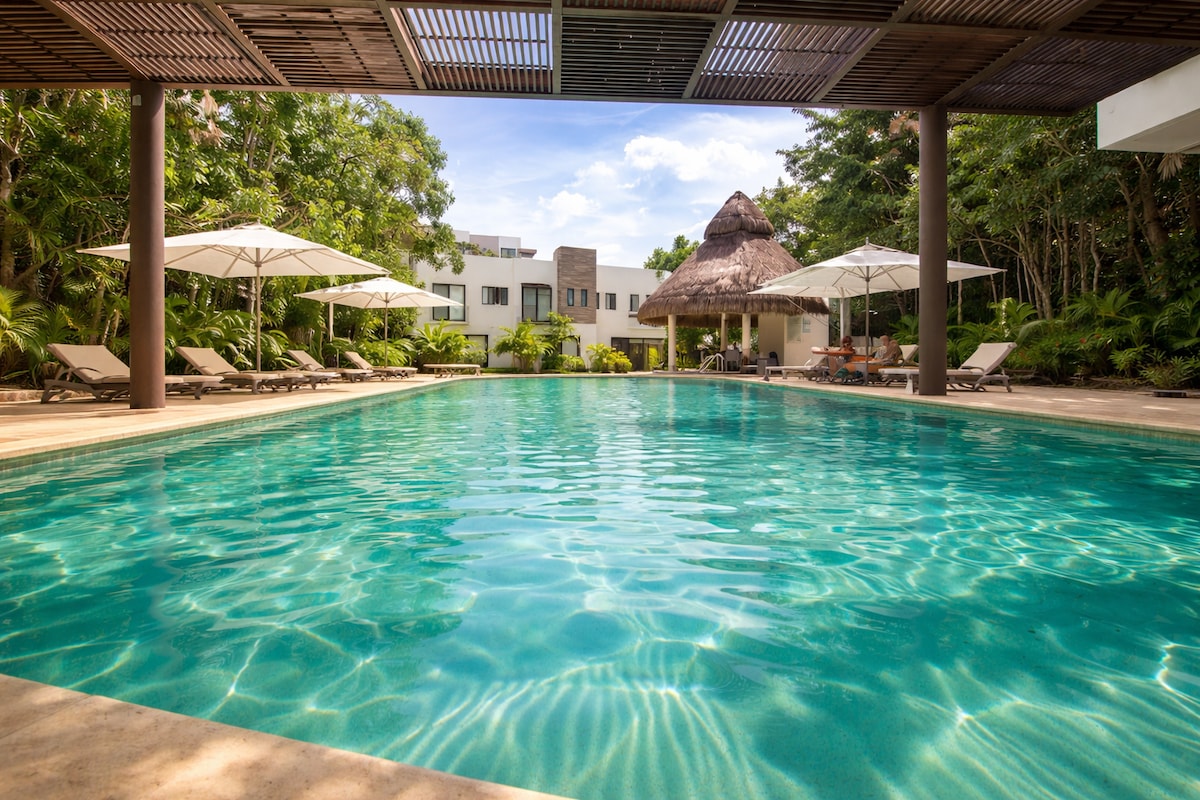 Discover the charm of the Caribbean and turn your trip to Playa into an unforgettable memory in a cozy apartment with views of the jungle, surrounded by lush trees. Perfect for families, we offer green areas, bike paths, swimming pools, barbecues, jacuzzis, kayaks, and beautiful water channels that surround the residences. Enjoy a business center, clubhouse, gym, and a rooftop, with security and surveillance 24/7. Just 5 minutes from the beach, in the exclusive area of Mayakoba.