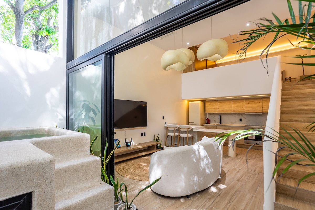 Wake up to 20-foot floor to ceiling windows overlooking the lush courtyard and walk upstairs to your private daybed and jacuzzi on your rooftop terrace. The building has a private complete gym, 12 resistance training machines, free weights up to 90lbs with adjustable benches, cables, smith machine, speed bike, and 2 ellipticals. There is a common area pool, three jacuzzis, a rooftop bar and moonlight theatre. Centrally located, Anah Playa is walking distance to everything in town.