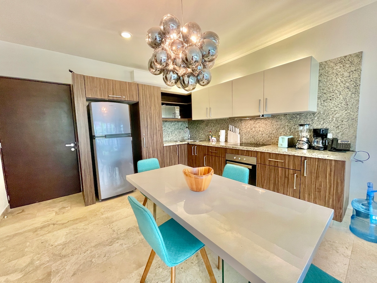 You will enjoy your stay in this spacious and modern condo, 881 sqft. It features a generous rooftop with stunning views of the city and the sea, a king-size bed, a large bathroom, a fully equipped kitchen, and an in-unit washer and dryer. During your vacation, you can swim in the crystal-clear waters of Playa Mamitas, which is just a 7-minute walk away. Additionally, you will find a wide variety of restaurants, bars, shops, and more on the famous 5th Avenue, located only a block away.
