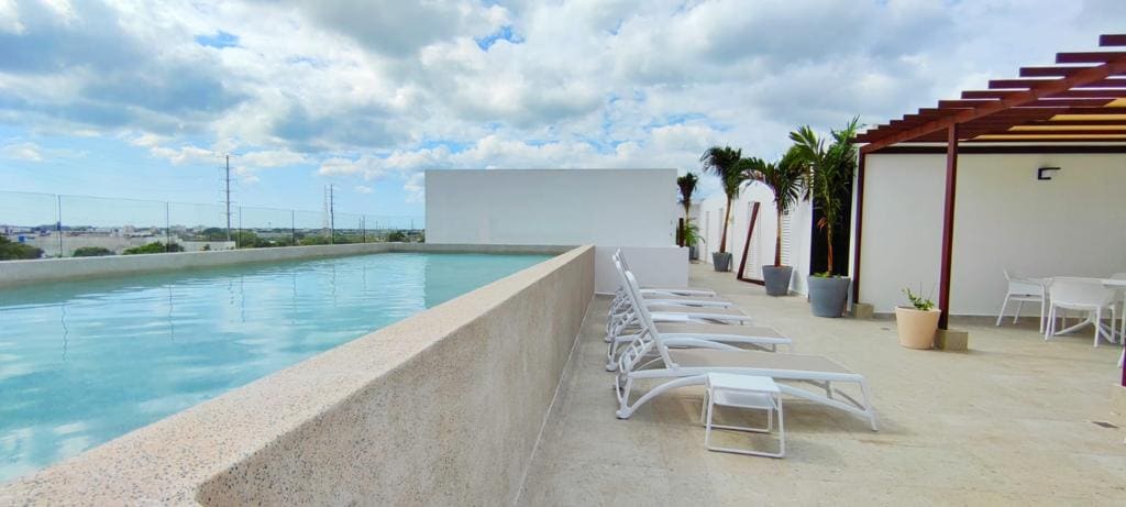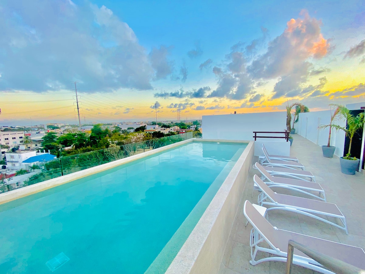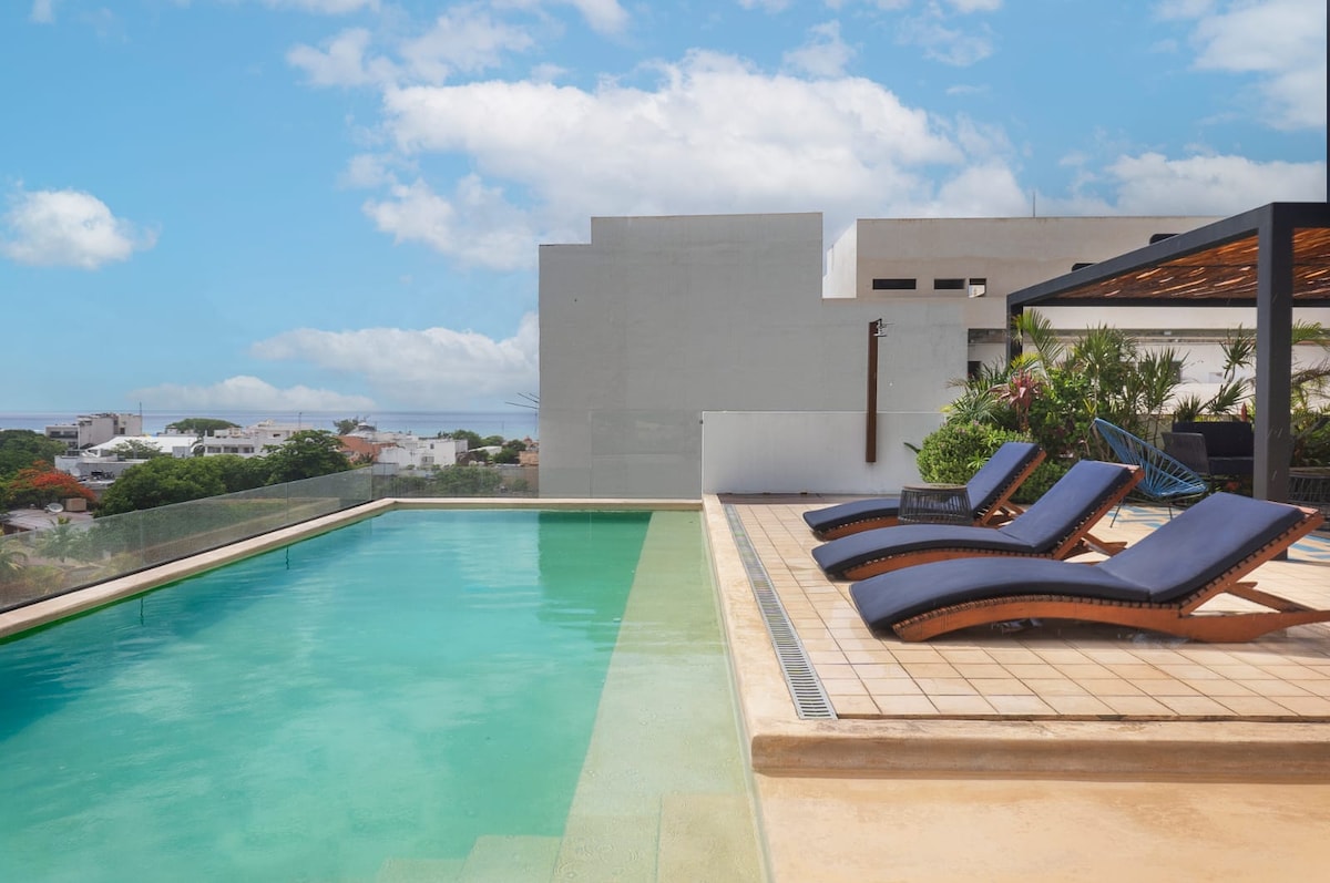 🪻A solo unos pasos de una de las playas más exuberantes y de la 5ta Avenida, este moderno departamento te brinda una experiencia sin precedentes. Reposa en una cómoda cama king, disfruta de tus pelis favoritas en Smart TV y explora tu creatividad en una cocina práctica y funcional. 🌿Disfruta de tu espacio al aire libre en un balcón privado. Y si buscas algo más especial, sube al rooftop: ahí te esperan una infinity pool, la vista parcial al mar y el radiante sol del Caribe.