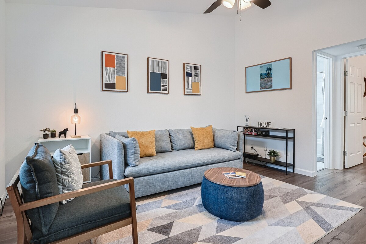 Modern 3BR, 2BA ranch-style retreat near the Domain with a huge backyard, boho-chic interiors, and room for up to 6 guests. Enjoy a fully equipped kitchen, luxury linens, 65” smart TV with streaming, high-speed Wi-Fi, and free parking. The covered porch is ideal for outdoor dining or morning yoga. Dog-friendly (pet fee applies). Minutes from Austin’s best dining, shopping, parks, and nightlife - perfect for couples, families, or remote workers looking for comfort and convenience.