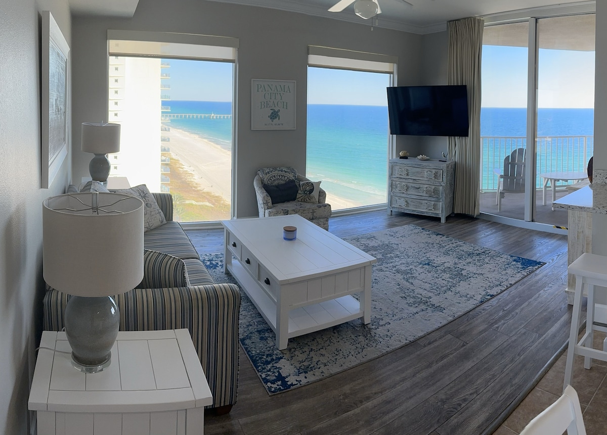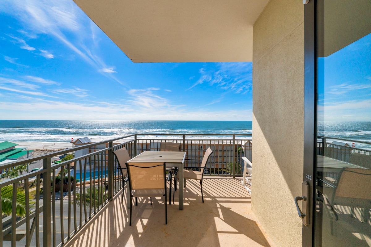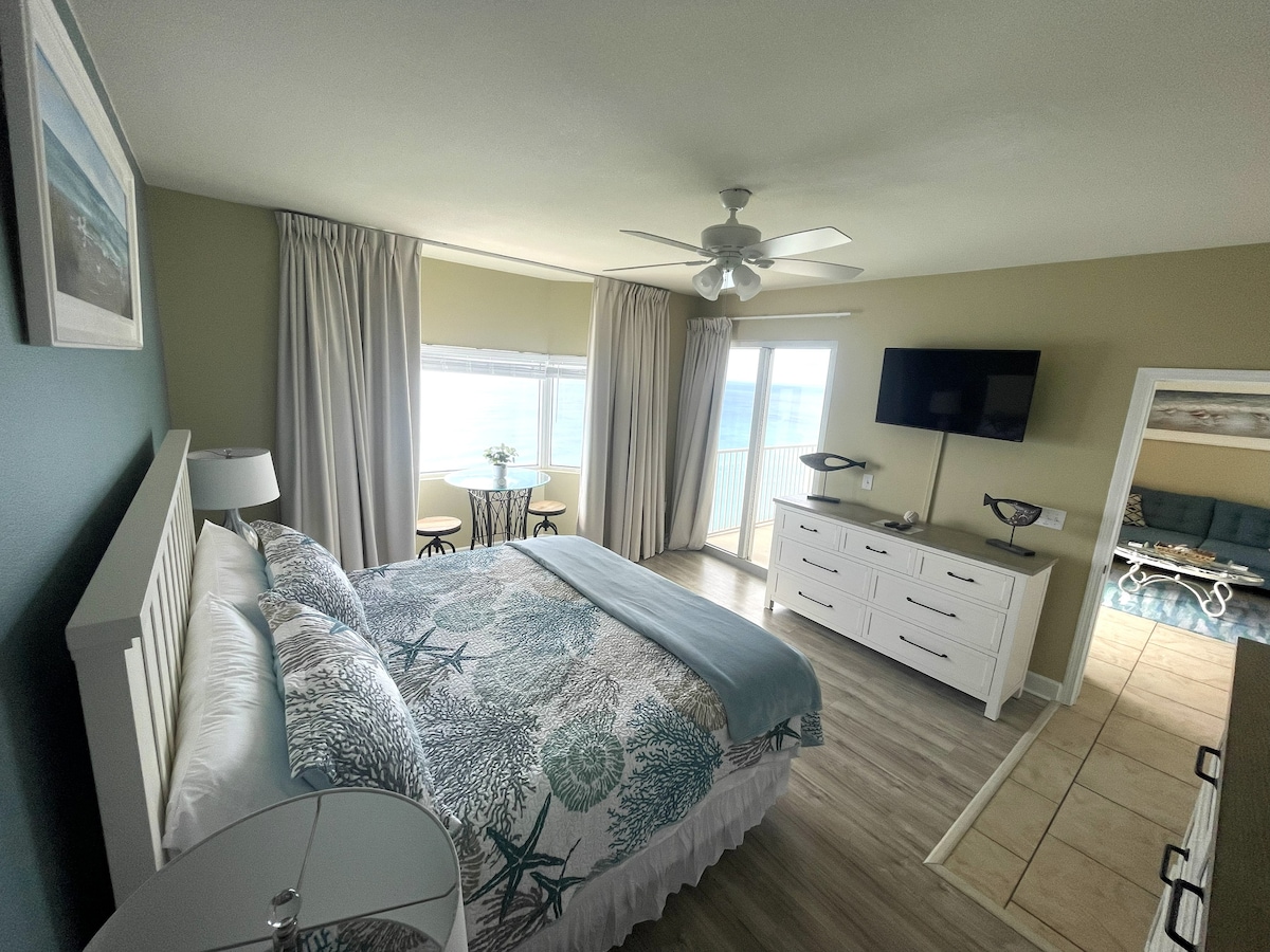 SPECTACULAR GULF-FRONT MASTER ! Amazing Westend Resort and RIGHT ON THE BEACH! Gulf Front Master with 30’ wide 160sqft PRIVATE balcony accessible from master & living area! Streaming 65" 4K TV plus 55” 4k in bdrms, fast Encrypted WiFi , tastefully decorated with “Beachy” feel fresh updates. This comfy getaway has 9’ tall sliders to view the Emerald Coast - pictures can’t do justice. Private bunk room, new sleeper. private beach & every amenity. Walk to Pier Park. Close to airport. It’s perfect!